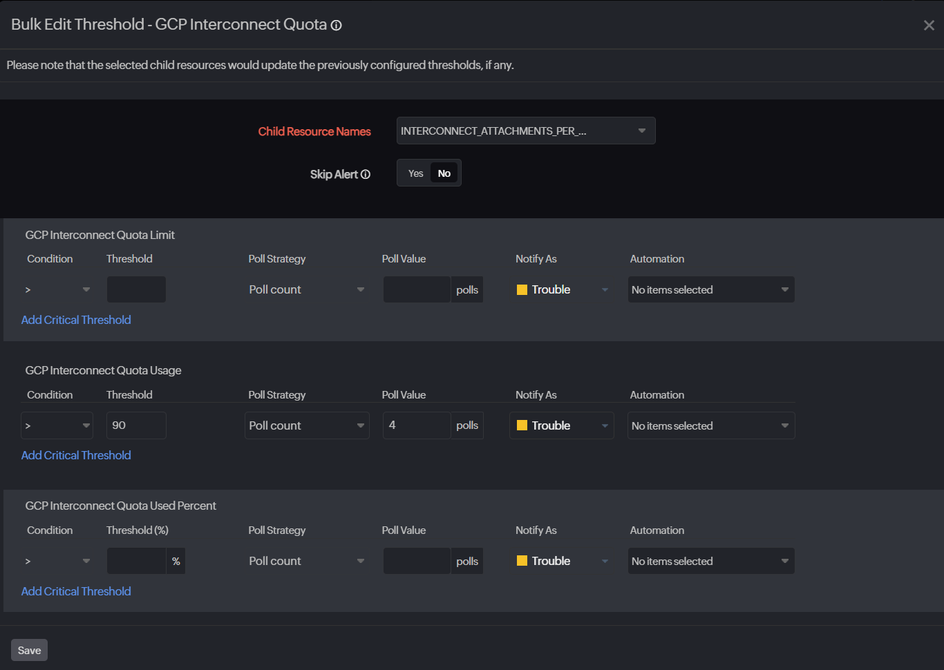 - Threshold: Enter the desired value for service quota utilization, which when breached, will trigger a trouble or critical alert.