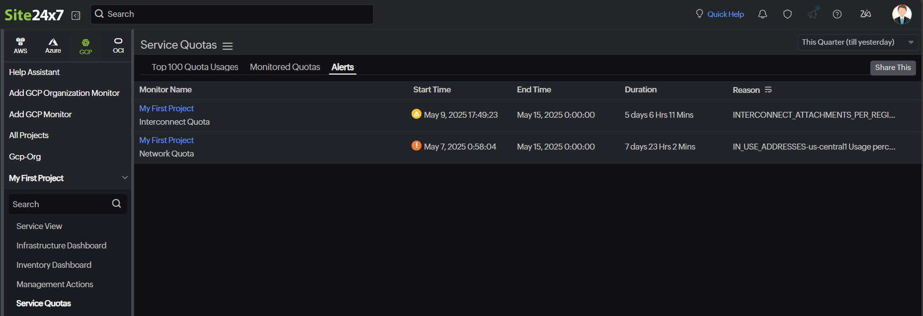- Navigate to Site24x7 > Cloud > GCP and select the project monitor in the left navigation pane > Service Quotas.