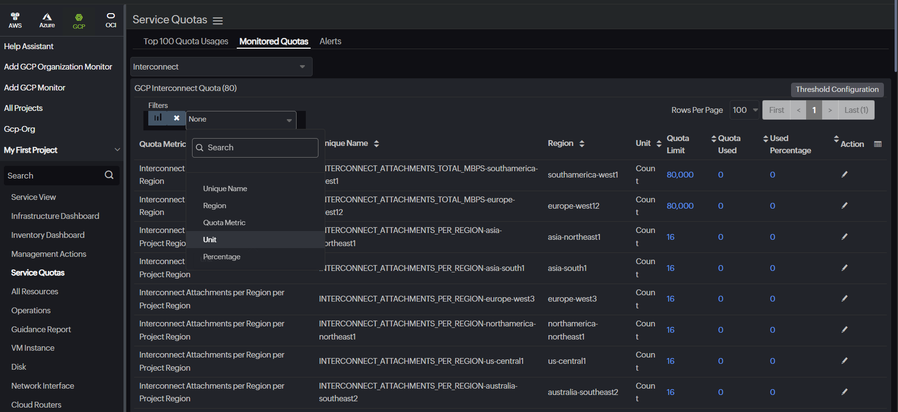 To view the Service Quota utilization of all the monitored GCP resource quotas, navigate to the Monitored Quotas tab and select the required category in the top-left drop-down menu.