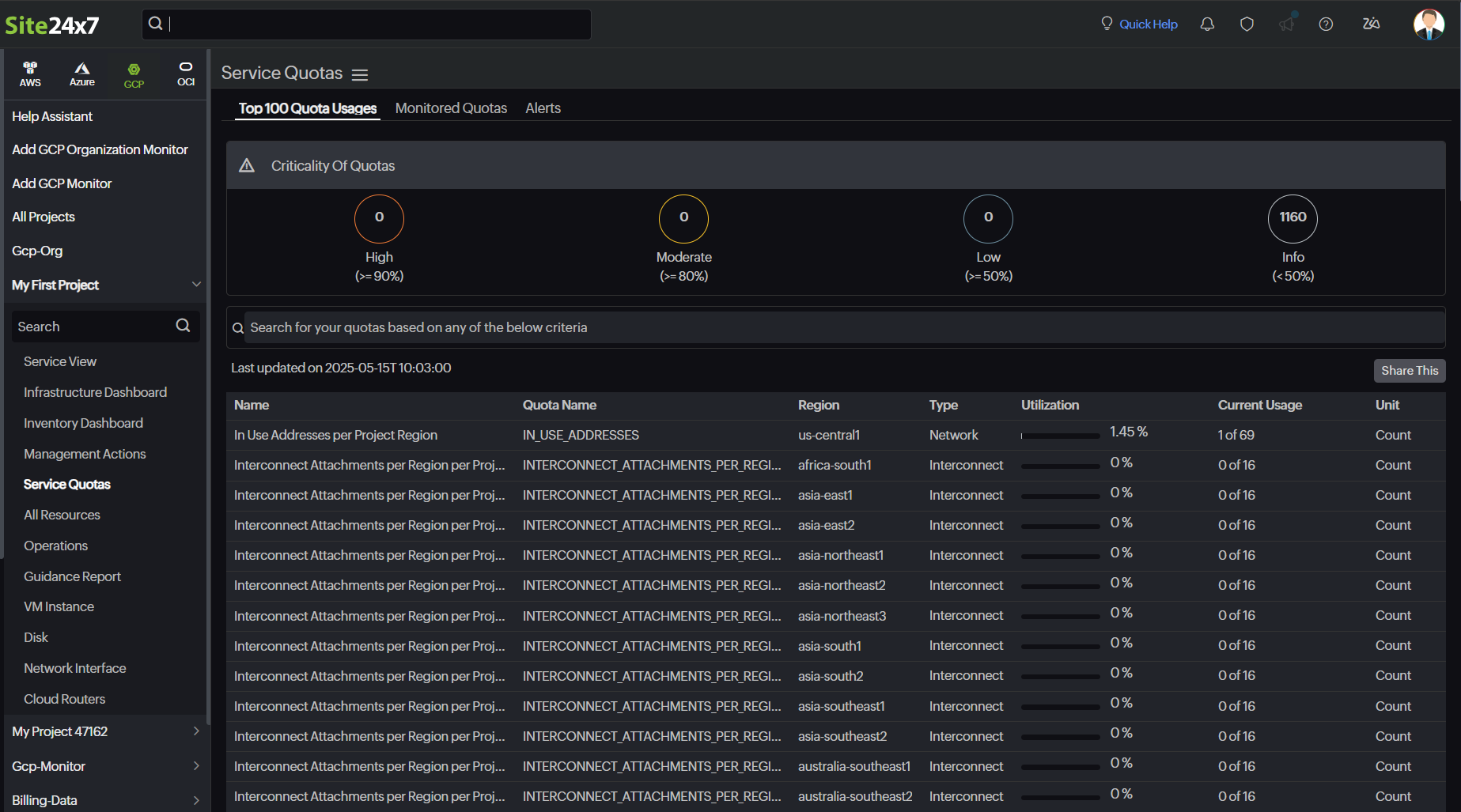 To view the Service Quotas page, navigate to Site24x7 > Cloud > GCP and select the project monitor in the left navigation pane > Service Quotas.