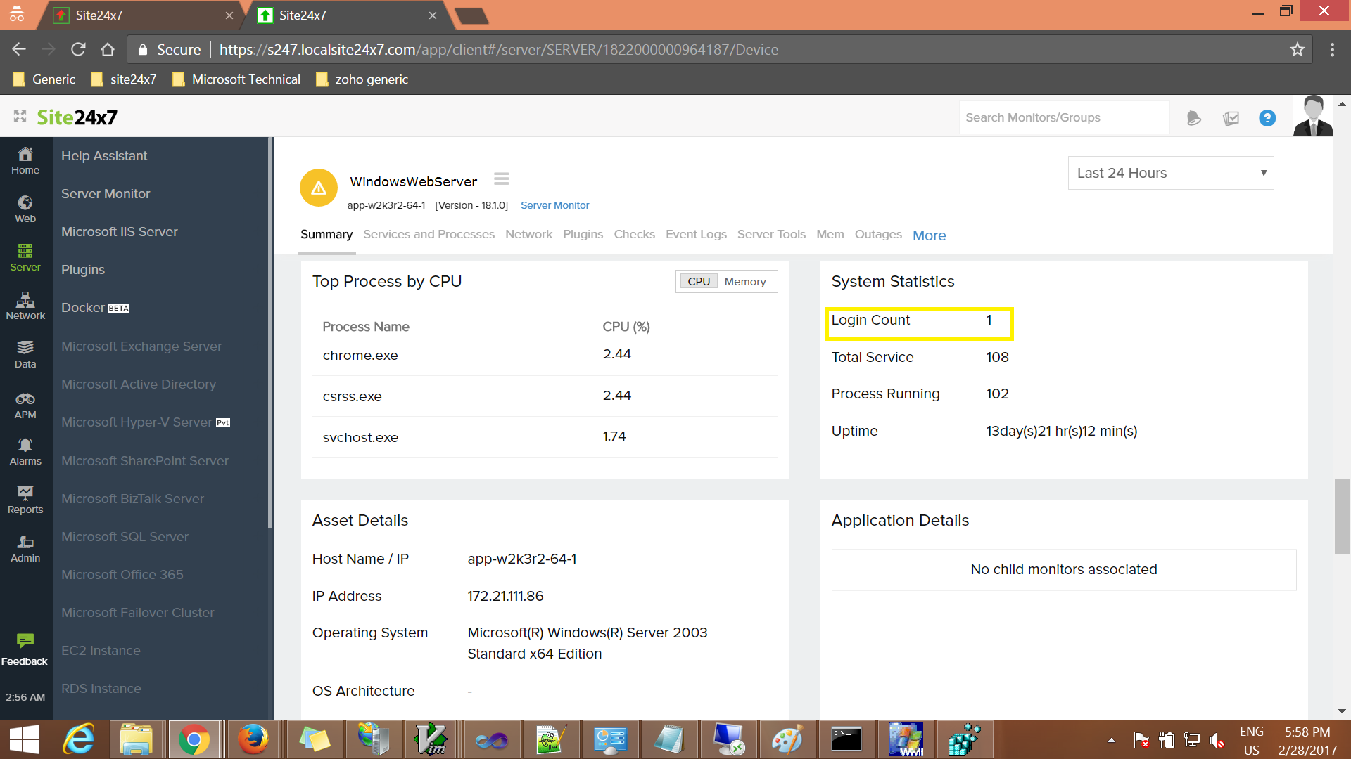Please check the value for login count in the Site24x7 client under System Statistics in the Summary page.