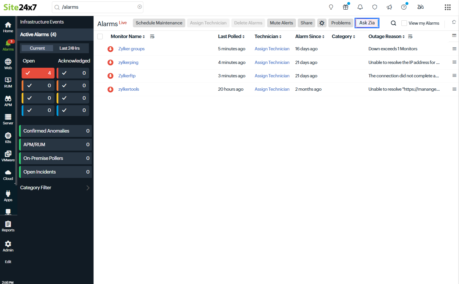 Using Ask Zia, you can analyze alarm data on the Alarms page to quickly identify issues, patterns, and insights.