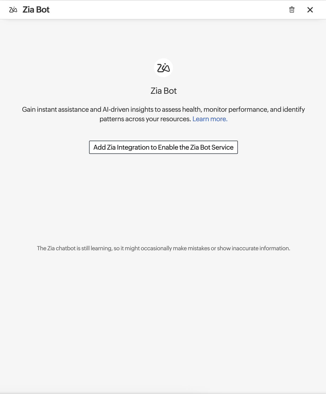 - Click Add Zia Integration to Enable Zia Bot Service to enable the Zia Bot service.