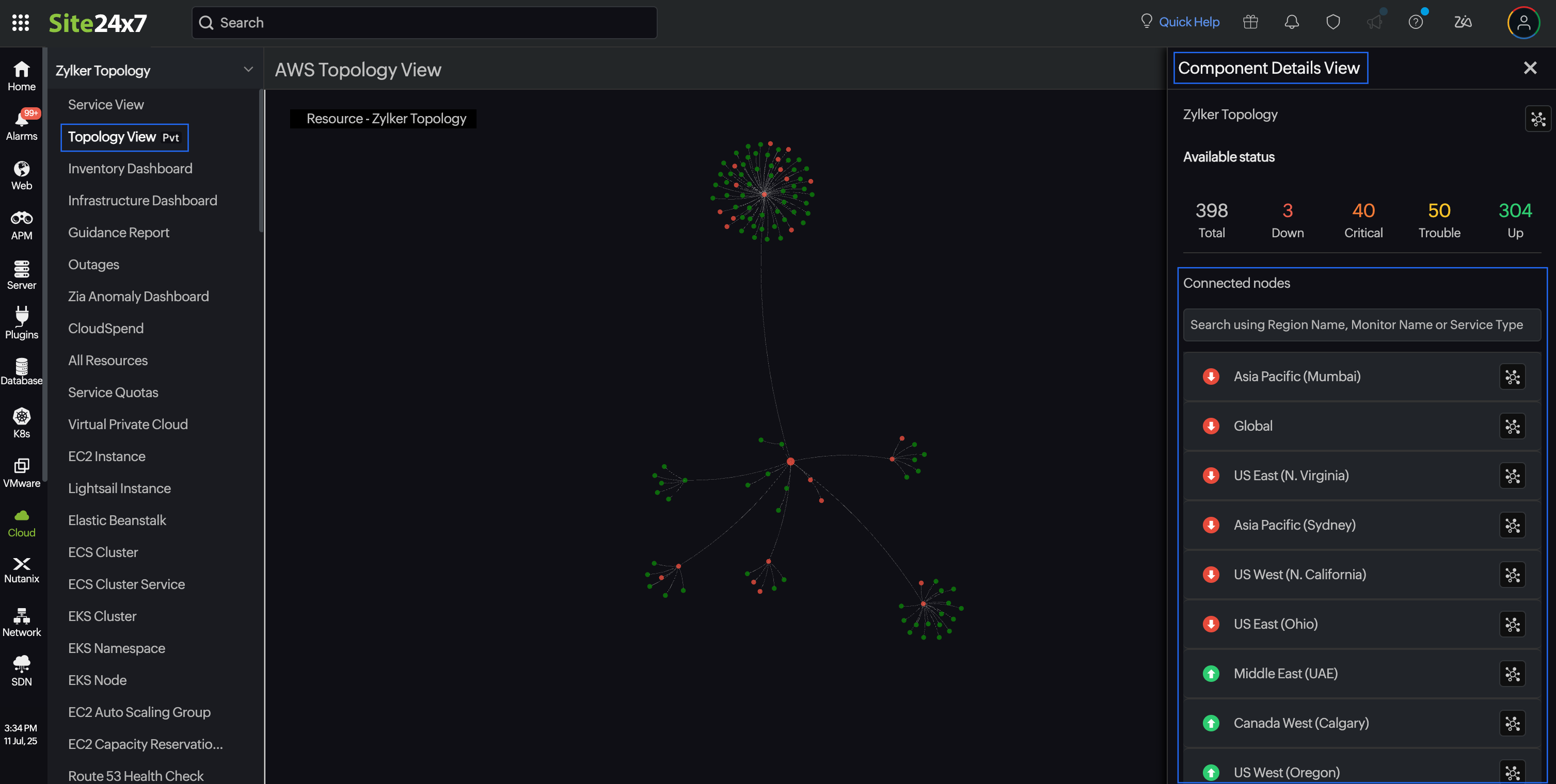 When you click on a node, the Component Details View panel appears on the right side. You can drill down into the specific region or service type. The UI visually shifts focus to that part of the topology, expanding or collapsing views accordingly. This makes root cause isolation faster and more intuitive.