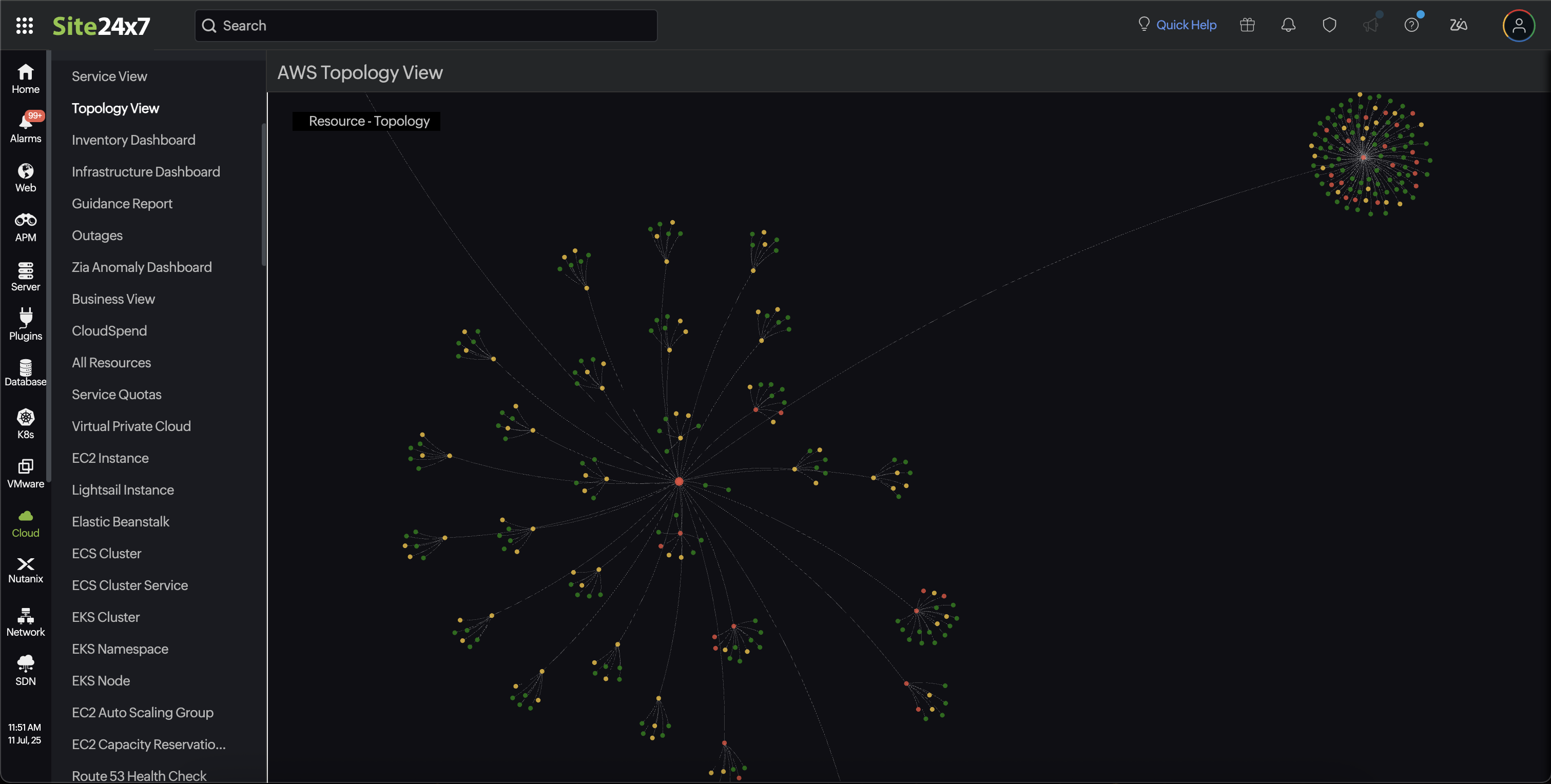 The Topology View is an intuitive visual interface that maps and displays your entire AWS infrastructure across multiple dimensions - account, region, and service type. This hierarchical, bird's-eye view enables users to comprehend the scope and interdependencies of AWS resources, simplifying the process of managing and troubleshooting cloud environments.
