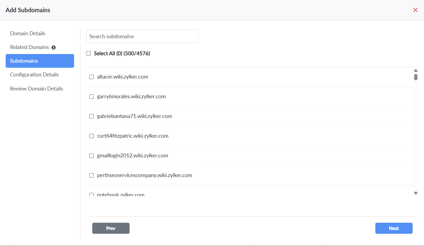- On the Subdomains page, from the list of discovered subdomains, select the subdomains you want to include in the routine scan, and click Next.