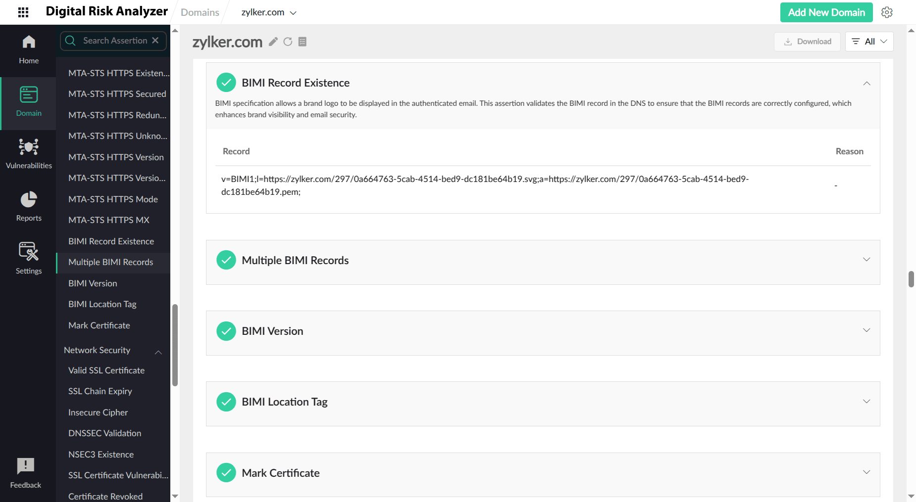 Digital Risk Analyzer helps prevent BIMI vulnerabilities by thoroughly assessing your email authentication configuration and identifying any weaknesses. It checks your DMARC, SPF, and DKIM records for proper setup and alignment, ensuring that your domain is protected against spoofing and unauthorized use. By proactively identifying and addressing these potential vulnerabilities, Digital Risk Analyzer helps you implement BIMI securely and effectively, maximizing its benefits while minimizing risks.