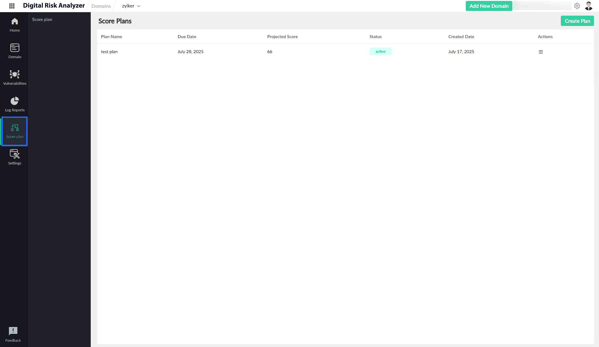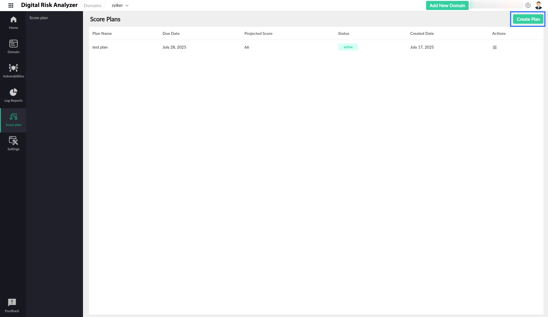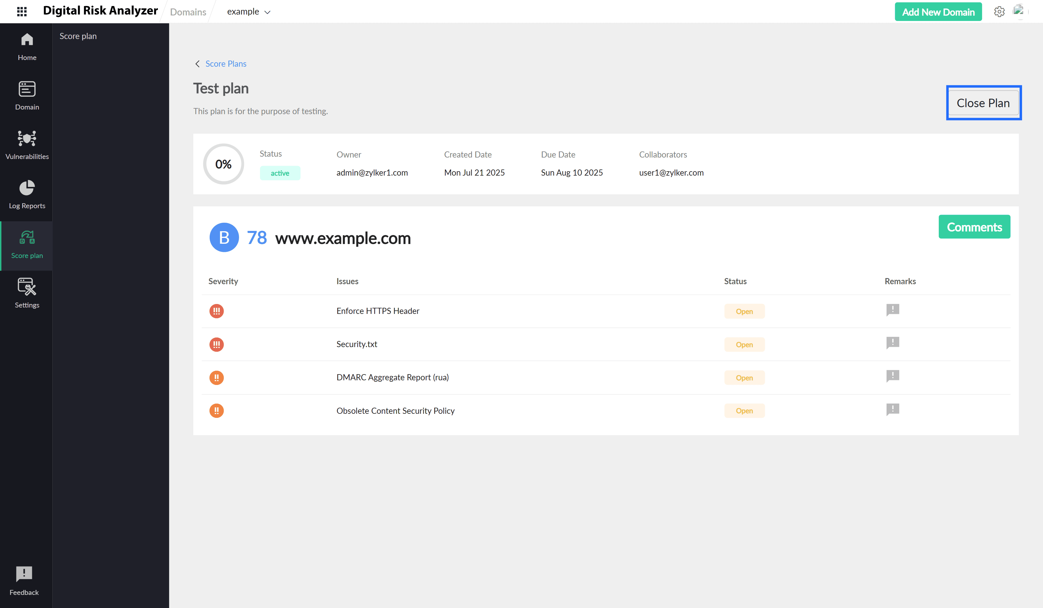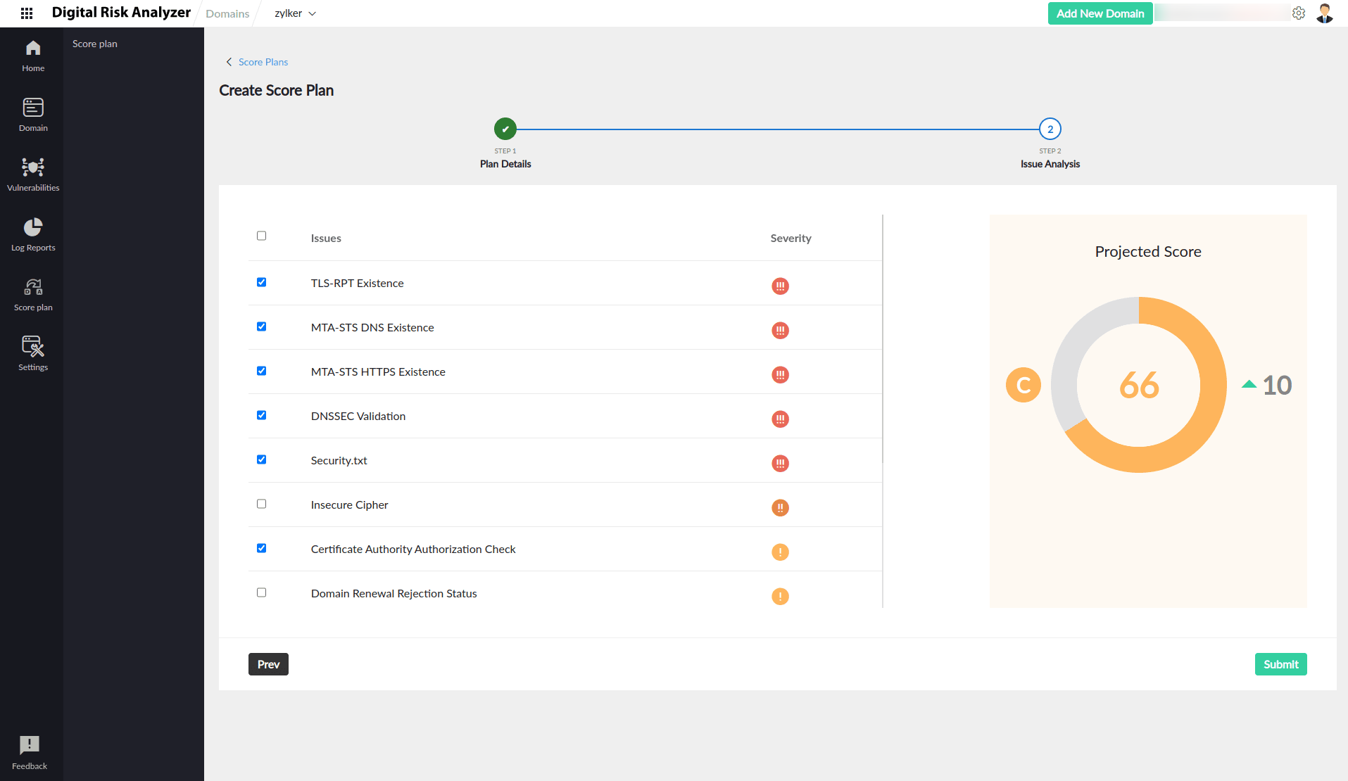 Boost your domain’s security score with the Score Planner feature in Digital Risk Analyzer. With Score Planner, you can collaborate with your team to create a plan that helps identify, analyze, and resolve vulnerabilities. The projected score in the Score Planner helps visualize the improvement in your security score, so that you can enhance your overall security posture.
