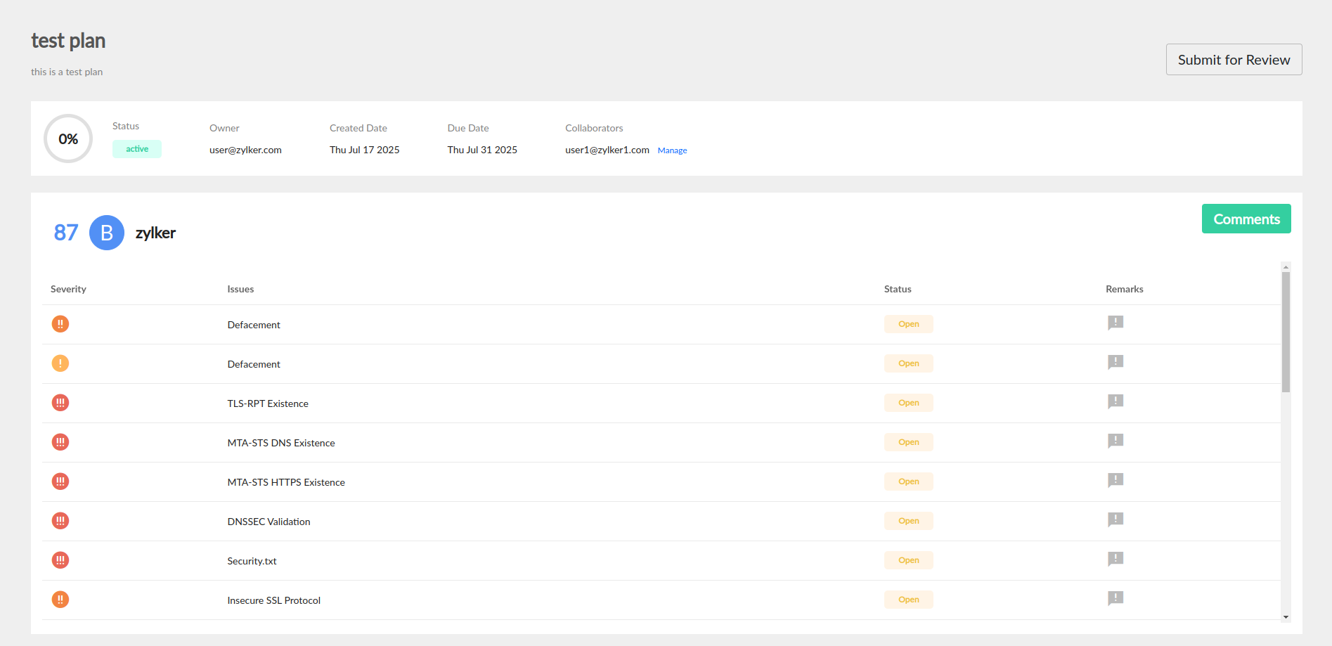 - Status: Displays the status of the issue as Open or Remediated.
