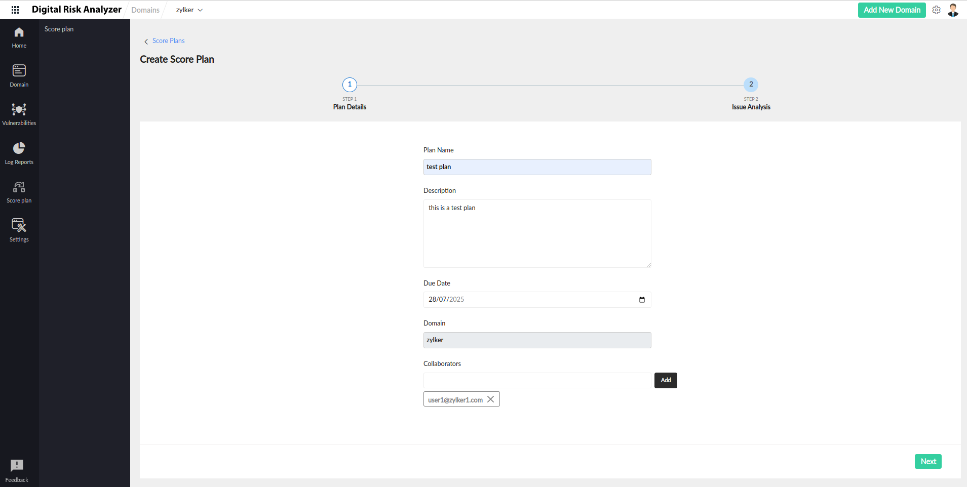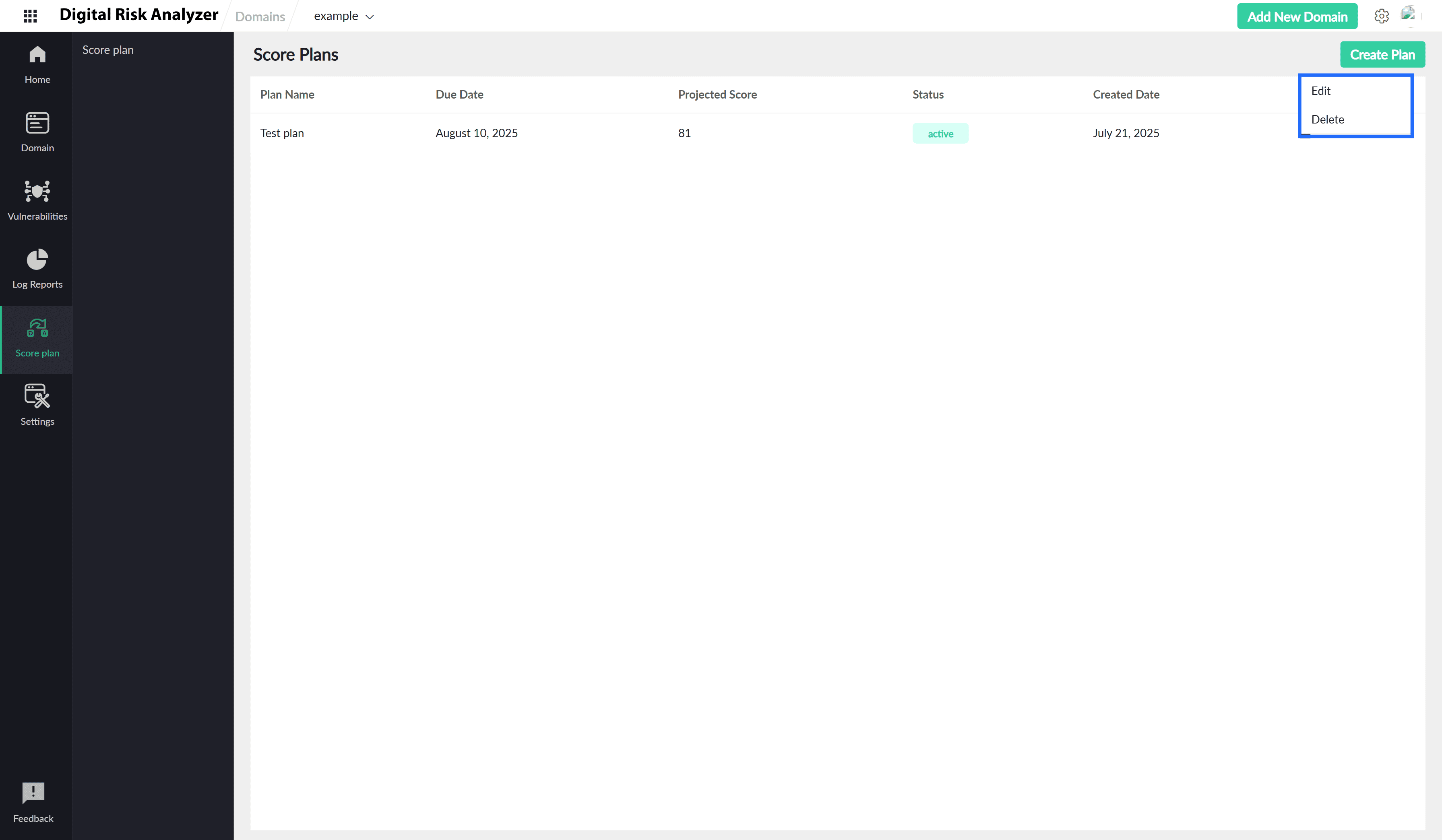 icon to set a due date for the completion of the plan. - Domain: Displays the domain for which the plan is created.