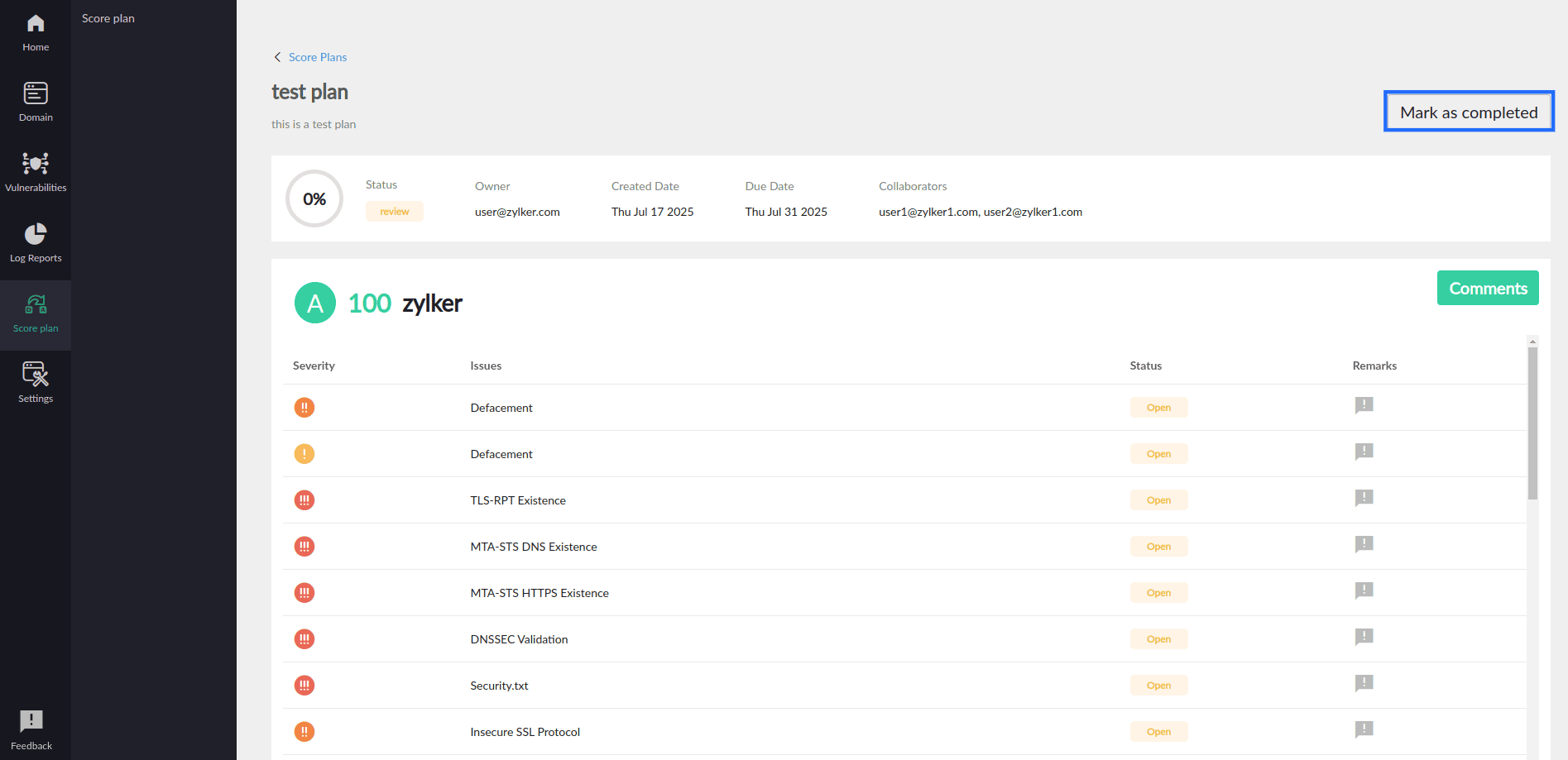 - Plan and assign critical vulnerabilities to specific team members with due dates to improve your domain’s cybersecurity score efficiently.