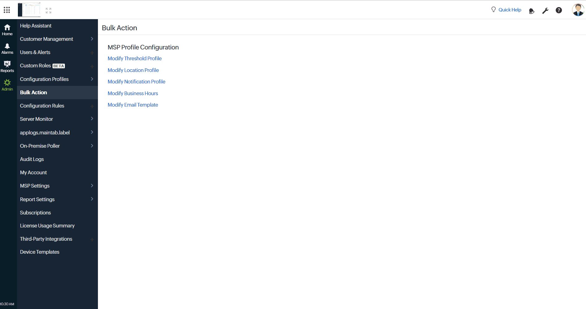The Bulk Action feature allows MSP admins to efficiently manage and update configuration profiles across multiple customer accounts at once. This feature simplifies administrative tasks by letting you modify several settings from a single interface, ensuring consistency and saving time.