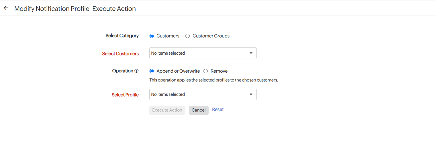 • Append or Overwrite: Assign the selected notification profile to the chosen customers or update an existing notification profile.