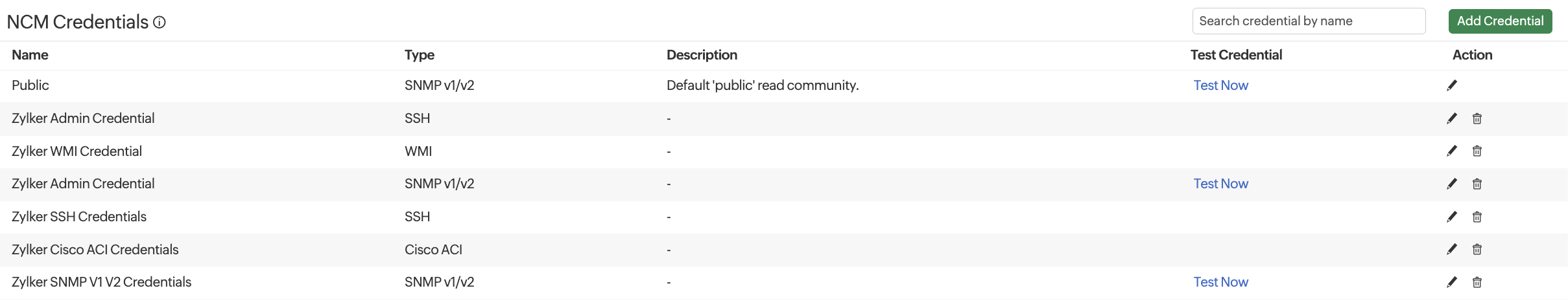 The NCM Credentials section provides an overview of various credentials associated with your networks or devices. The supported credentials are SSH, Telnet, TFTP, SCP, and SNMP v1, v2, and v3. You can view, edit, or delete the associated credentials from the network devices.