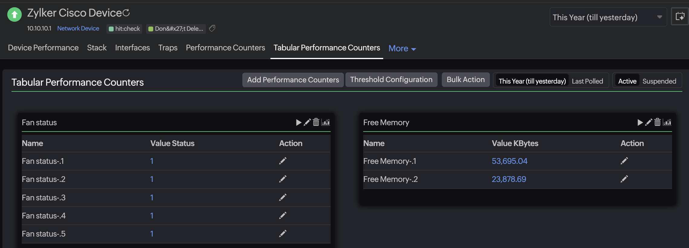 As a network admin, you want to monitor the In Octets of all the interfaces in your network device. To monitor tabular objects, you need to add the individual performance attributes for multiple instances under multiple interfaces. But doing this manually is time-consuming and error-prone. When you use tabular performance counters, all instances of a tabular object are added automatically once you've added a single tabular OID. For example, after you've added the tabular OID of In Octets, the In Octets of all interfaces will be displayed in the table.