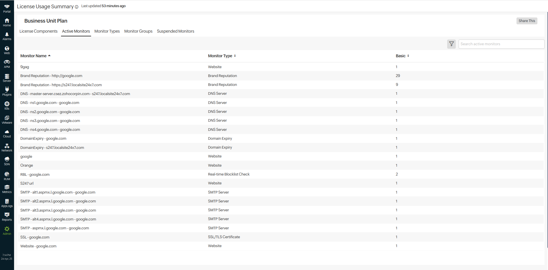 - Active Monitors: View the list of active monitors, along with their names, types, and license consumption details. You can filter the details based on component, monitor group, or monitor type.