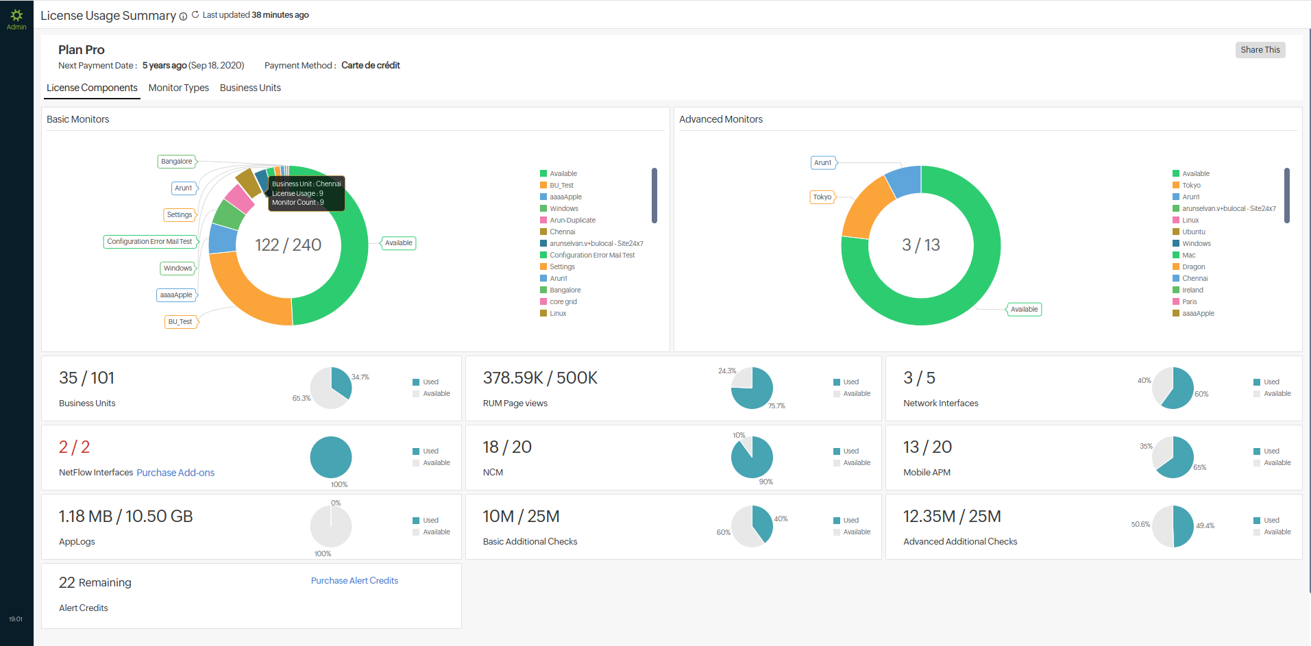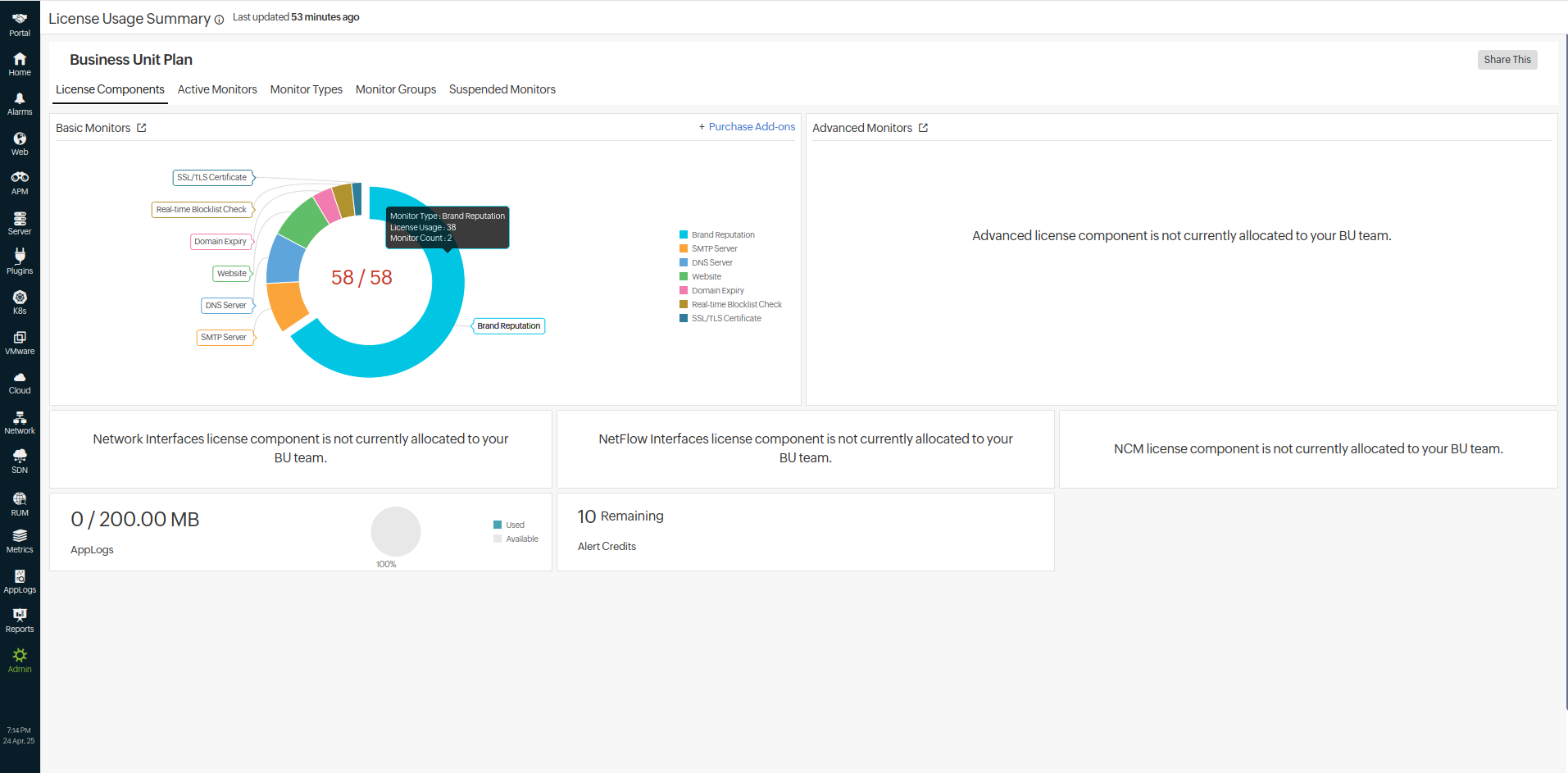 - License Components: View the license consumption for each monitor type using the doughnut view for both basic and advanced monitors. The legend is scrollable, and you can view various monitors. You can view the consumption and availability of various license components and new components that are recommended.