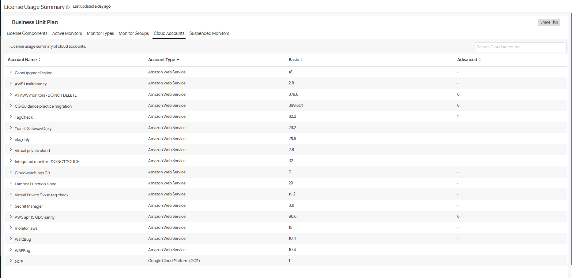 - Cloud Accounts: View the accounts associated with cloud services and their license consumption. Use the drop-down menu to view more details like monitor name, type, group, and license consumption.