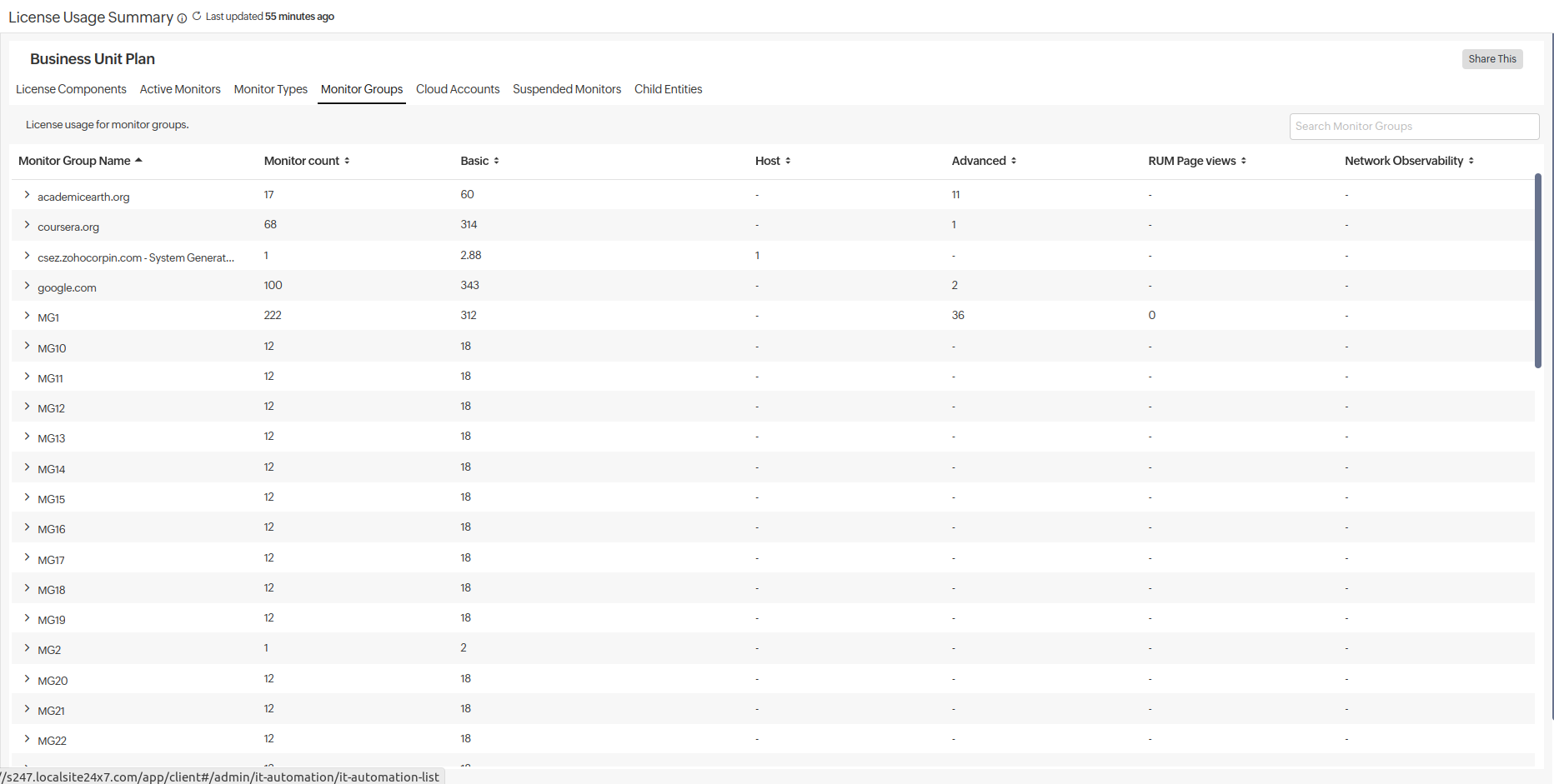 - Monitor Groups: View the monitor group name list, the monitor count in each group, and their license consumption details. Click the drop-down menu to drill down the details of monitors in the monitor group, their type, and their license consumption.