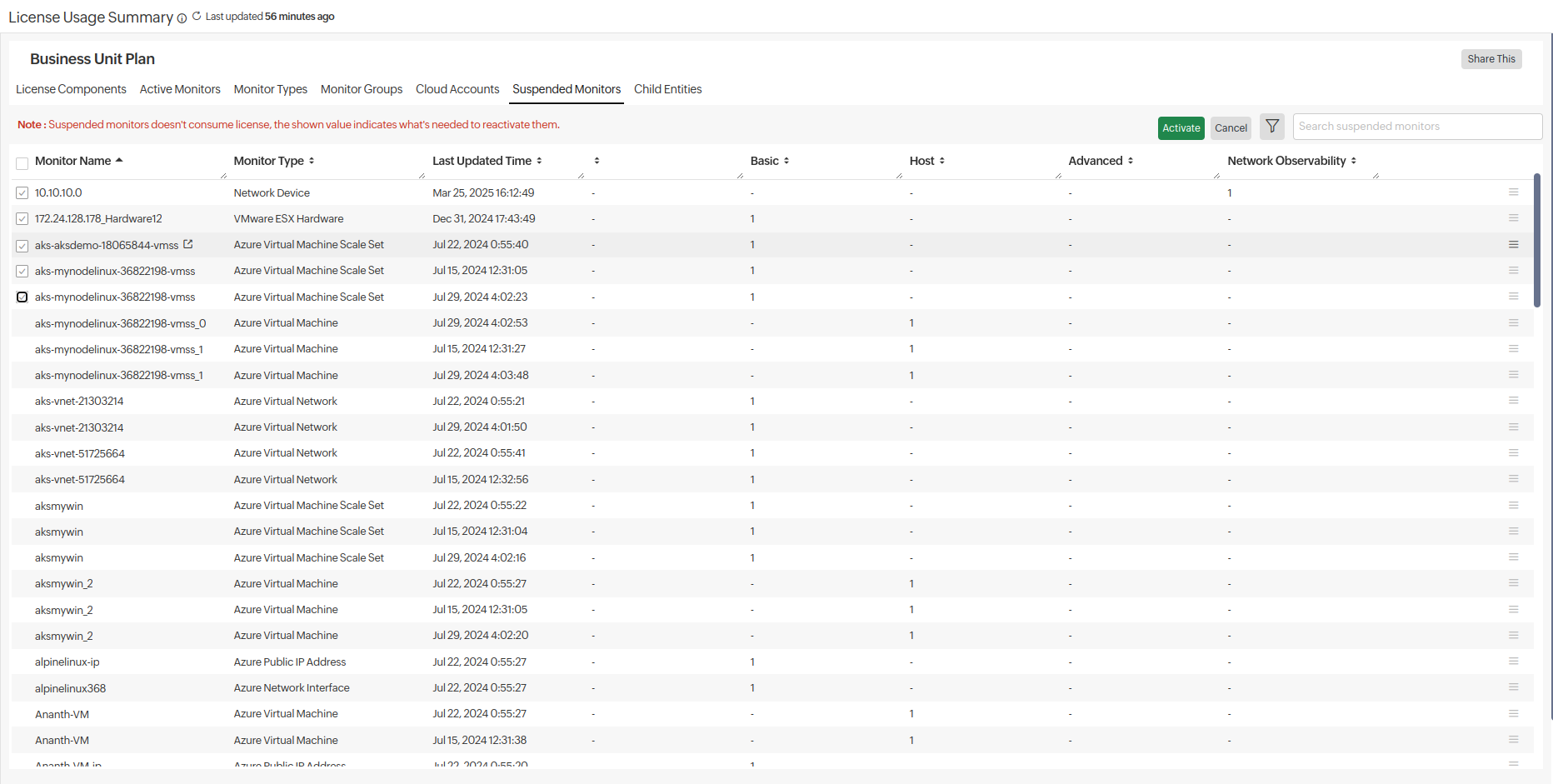 - Suspended Monitors: View the suspended monitors that no longer consume licenses. The usage numbers indicate the licenses required to reactivate them. Click the icon to Activate, Delete, multi-select, and take bulk action on them.