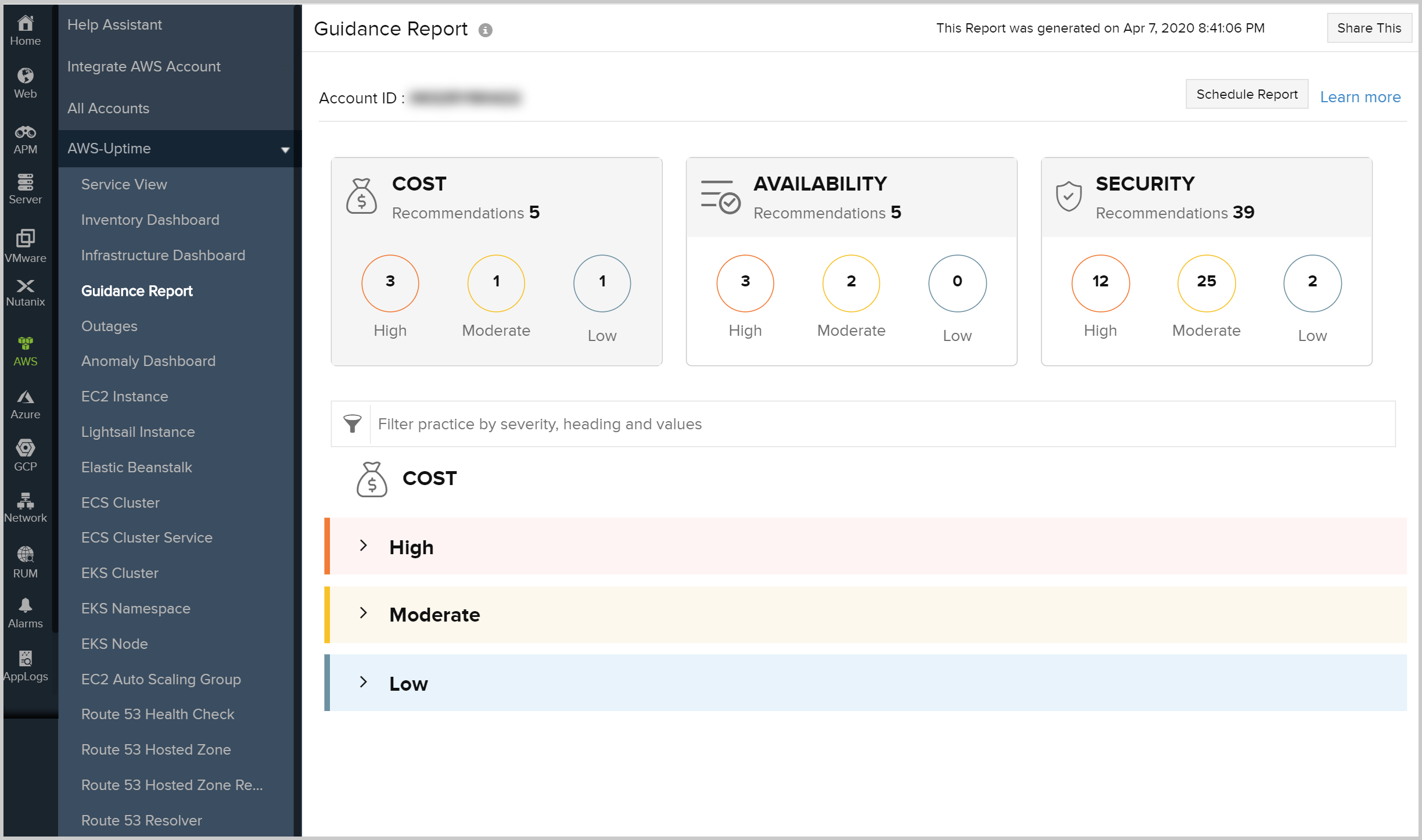Site24x7's Guidance Report is color-coded based on severity to let you know exactly how many AWS resources require attention at a glance. View a high-level overview of the number of best practice recommendations identified for your AWS account at the top of the report, with all recommendations grouped by severity (High, Moderate, and Low).