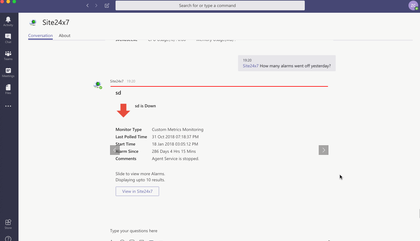 ChatOps, sometimes referred to as conversation-driven DevOps, is all about using chatbots and real-time communication tools to streamline software development and operations tasks. DevOps teams can use ChatOps in Microsoft Teams to simplify IT monitoring and incident management tasks. A great example would be the Site24x7 chatbot in Microsoft Teams. It's a custom, automated monitoring assistant built on Site24x7's homegrown natural language processing framework that uses dialog inputs and other interactive elements instead of simple text commands.