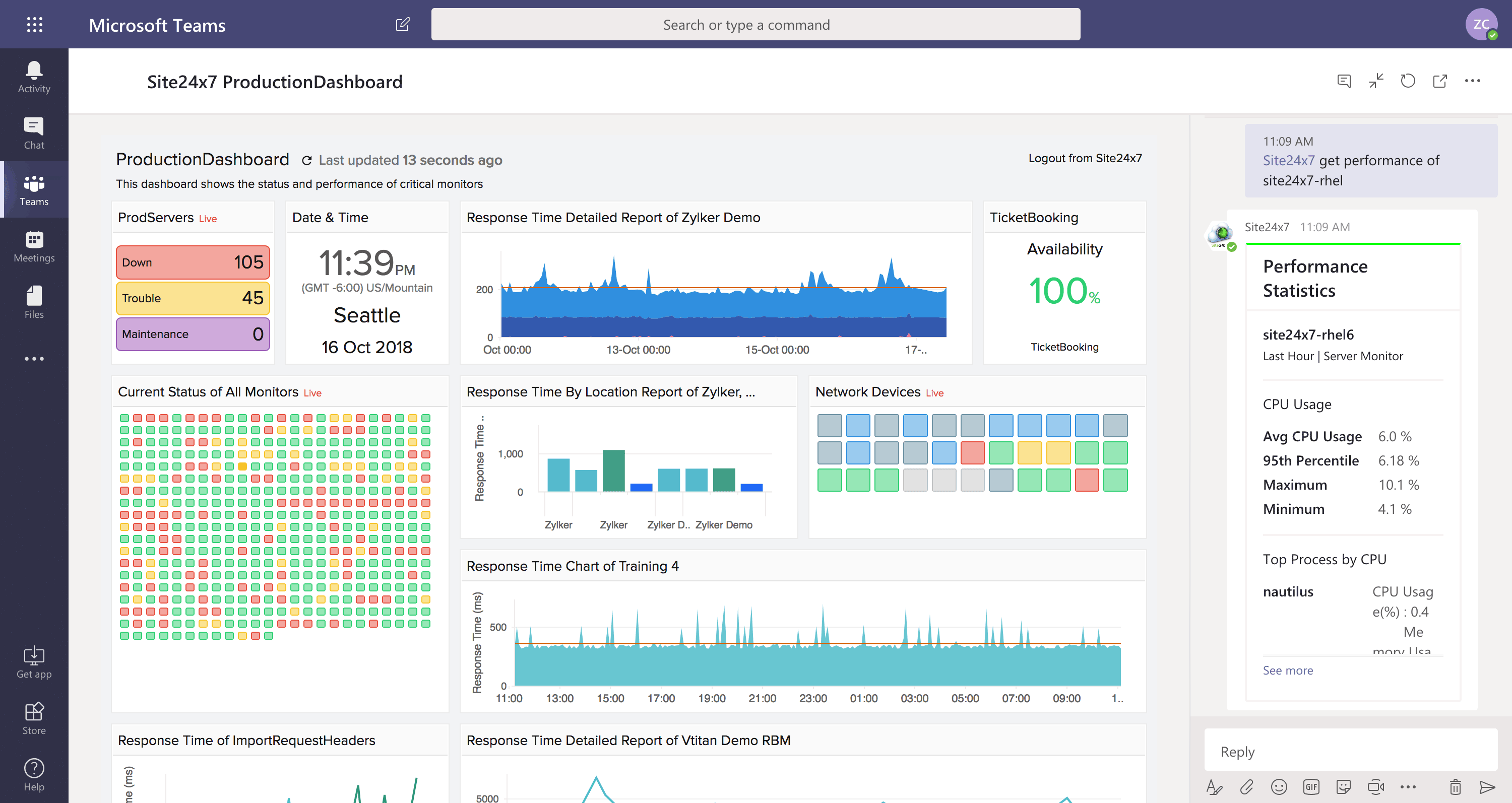 Site24x7's powerful Custom Dashboard feature offers both operations teams and developers rich insight into performance outliers from all layers of their infrastructure, on a single pane. By connecting Site24x7 with Microsoft Teams, you can use Teams' Tabs feature to import preconfigured Custom Dashboards into Teams' channels. This integration facilitates faster incident resolution and improves DevOps productivity, as development and operations teams can effectively share tips and collaborate on issues on a common channel.