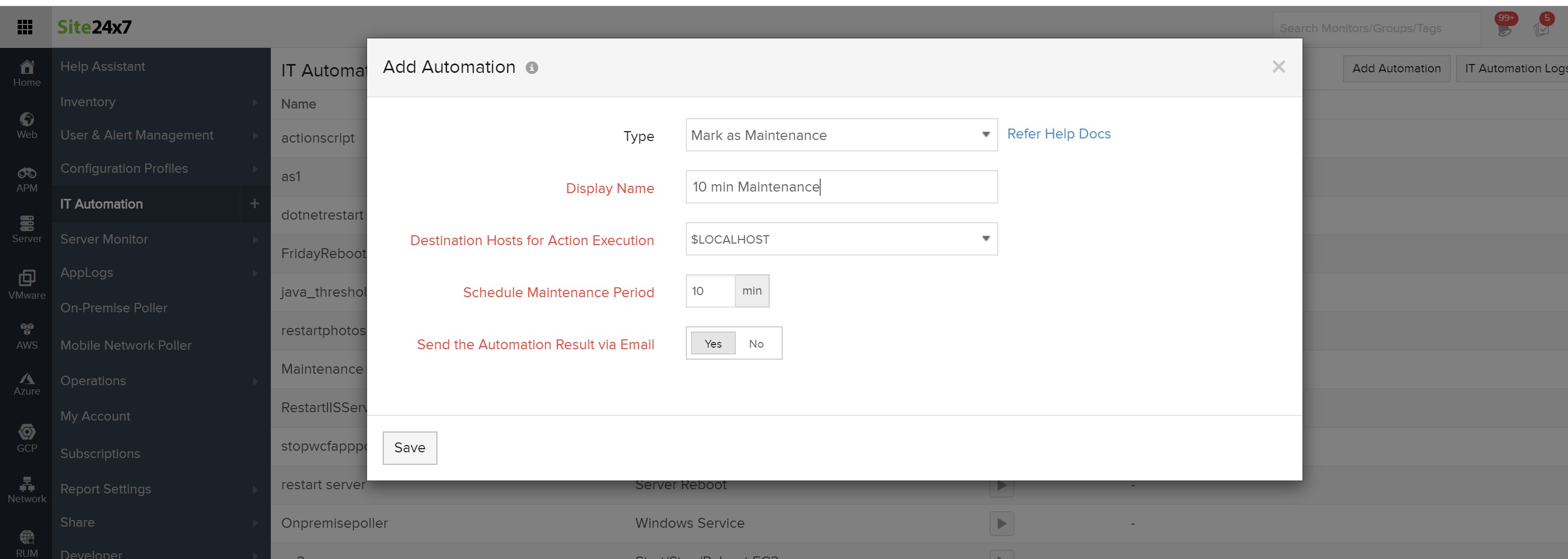 2. To create an mark-as-maintenance (MaM) automation goto Admin > IT Automation > click on the + > select types as MaM. Once this is done you can set this in the above step.