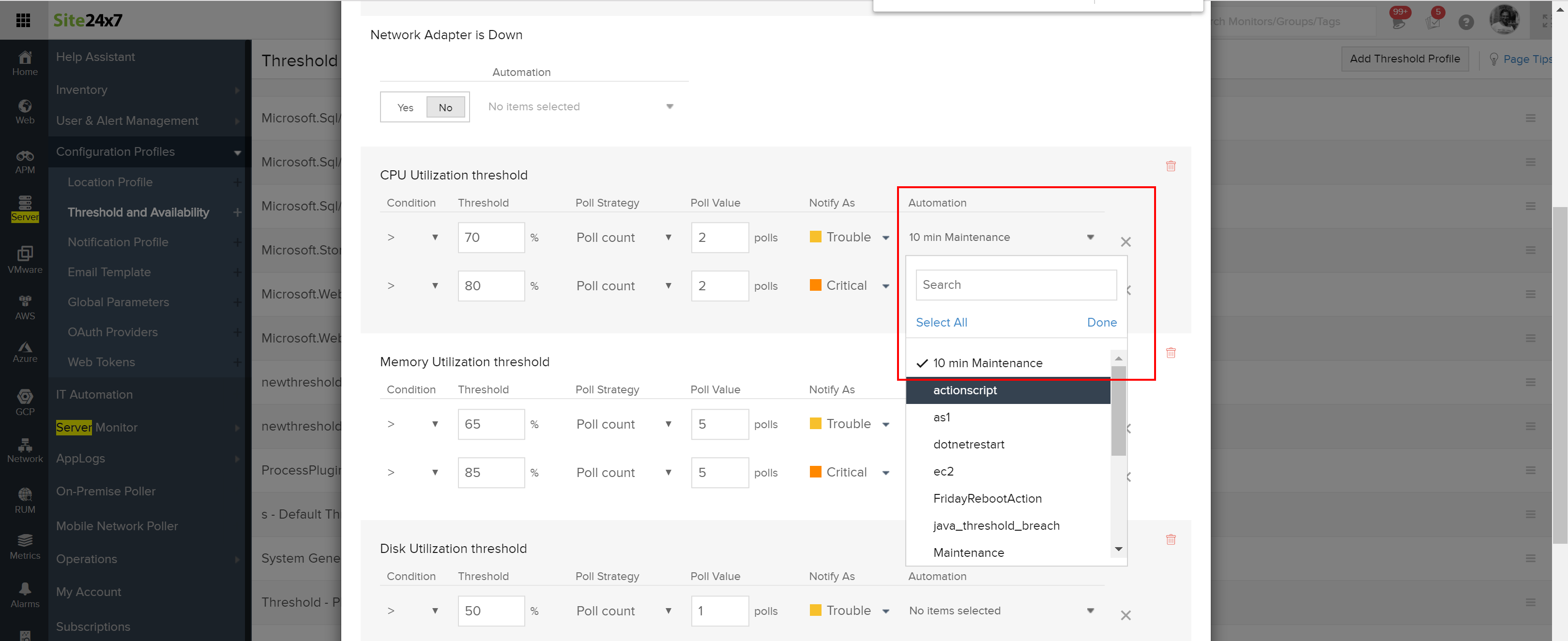 1. In server threshold profile > Under the attribute CPU Select the automation you want to trigger. I have created an mark as maintenance for 10 min automation.
