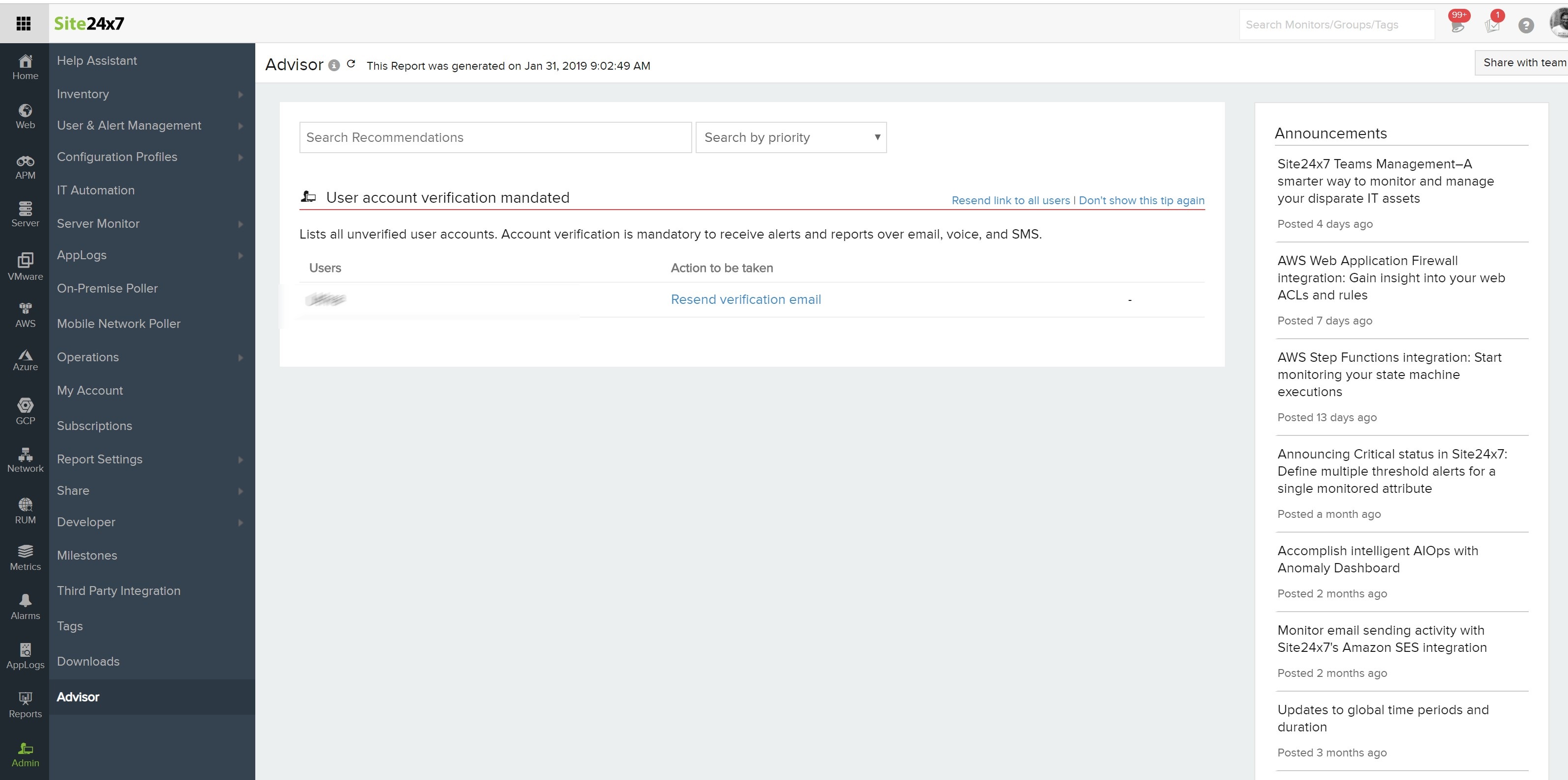 In our newly added Advisor section under Admin tab, we have a recommendation for unverified users. Here, you also resend the verification link for all the unconfirmed users.