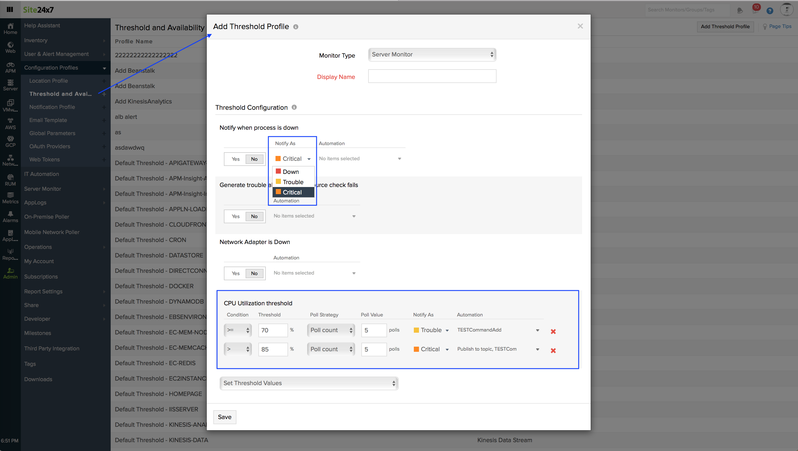 Site24x7 allows you to set thresholds that offer flexibility when managing service outage alerts. Every monitor has a unique set of attributes for which the threshold values can be applied. With the introduction of critical alerts, we've revamped the current threshold profile form to include a dual-threshold alerting capability for single attributes. You can program the alarms engine to sense the breach and trigger a specific kind of alert, e.g. Trouble or Critical.