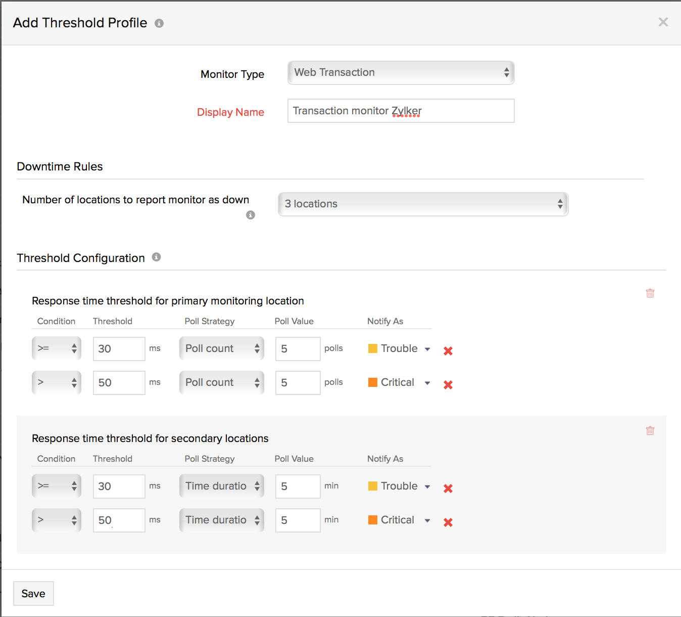As shown in the image below, you can configure a threshold profile for the monitor, and specify unique baseline values and alerts. Attach the threshold profile to a web transaction monitor. Once the thresholds are breached, unique alerts are instantly delivered to the monitor's user alert group.