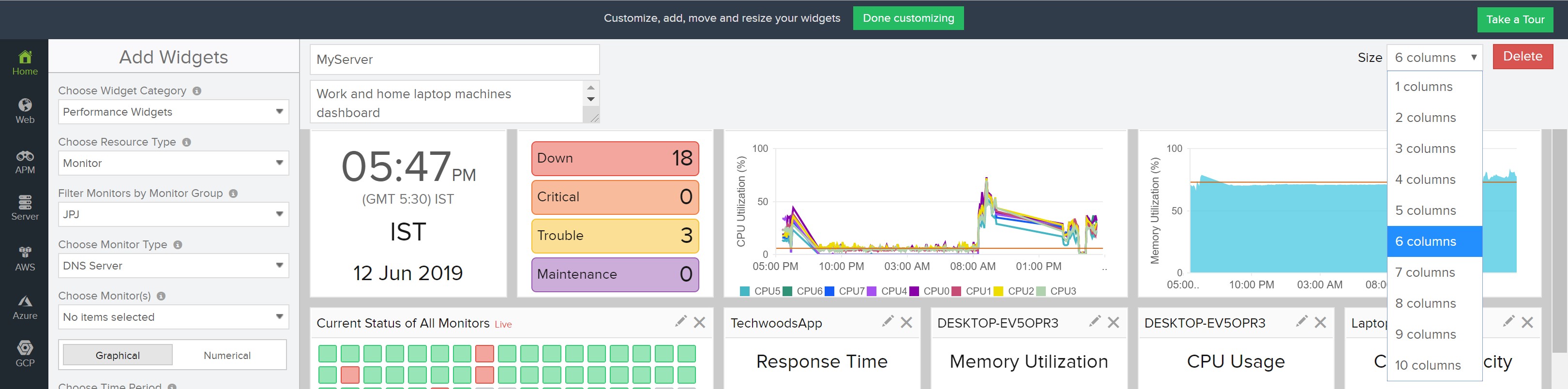 3. If I have missed a site and then want to add it at a later date, I can add it but it goes at then end. No way I can drag it in a position to rearrange alphabetically. If I drag a panel somewhere up, it pushes all other panels vertically down for one column only, which messes up everything. The desired behaviour should be to push all the panels to the right. If this is not feasible, at least allow user to sort widgets in the dashboard alphabetically by the name of the monitor/widget.