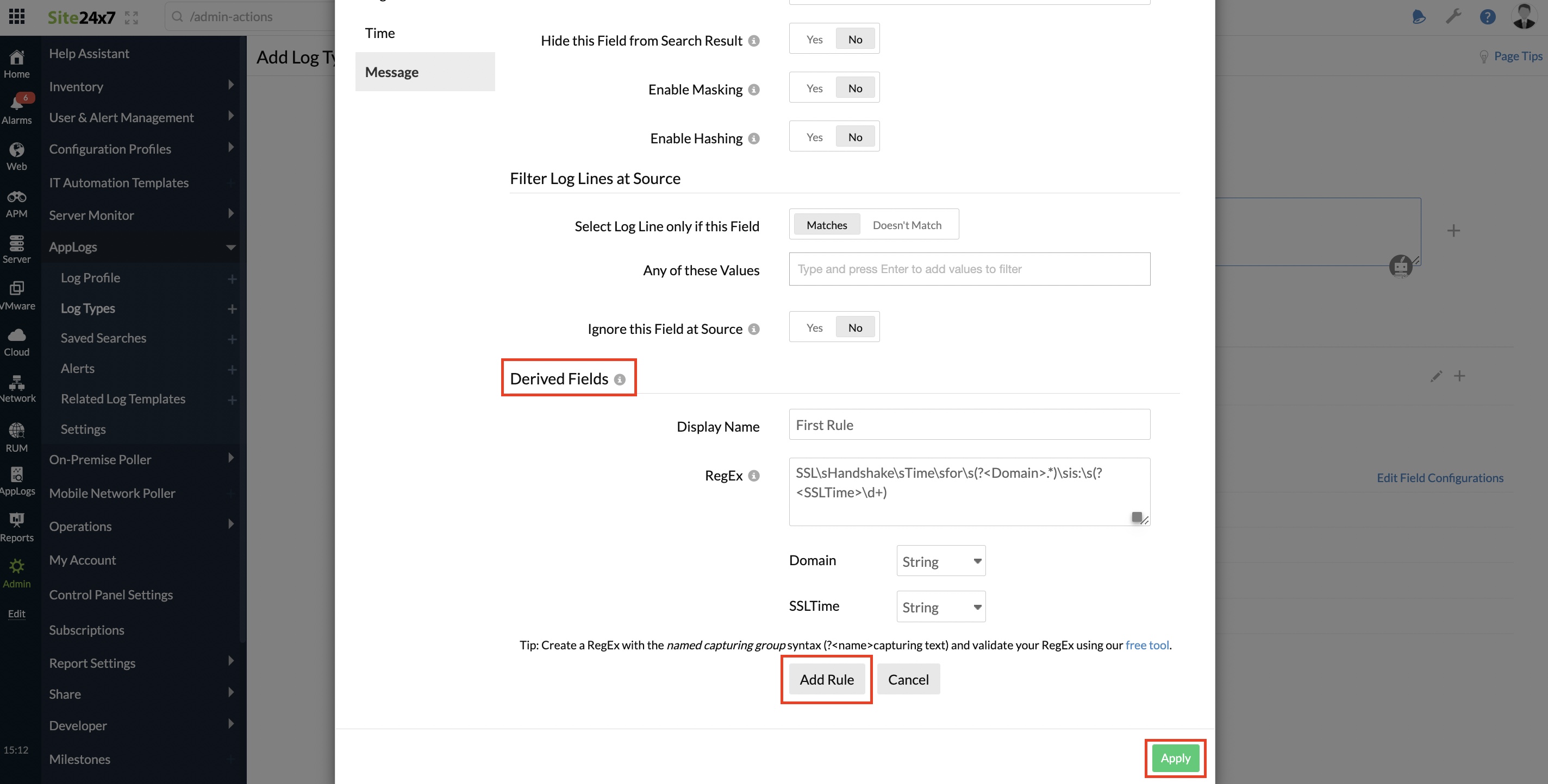 We are introducing support for derived fields in Site24x7 AppLogs. This feature enables you to create custom parsing rules for log fields that help you extract valuable information. For example, a log file may contain a treasure trove of information in its message field, which can come in a variety of formats.