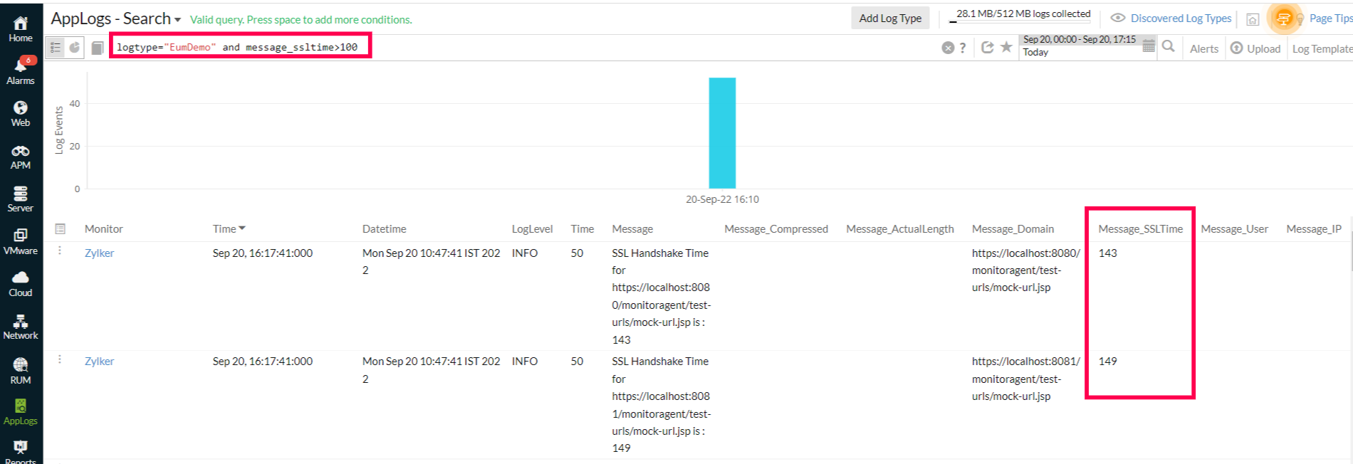 This query fetches the log entries with the log type EumDemo and a message field containing the ssltime greater than 100. You can also perform searches by combining the derived fields in the same query as below: