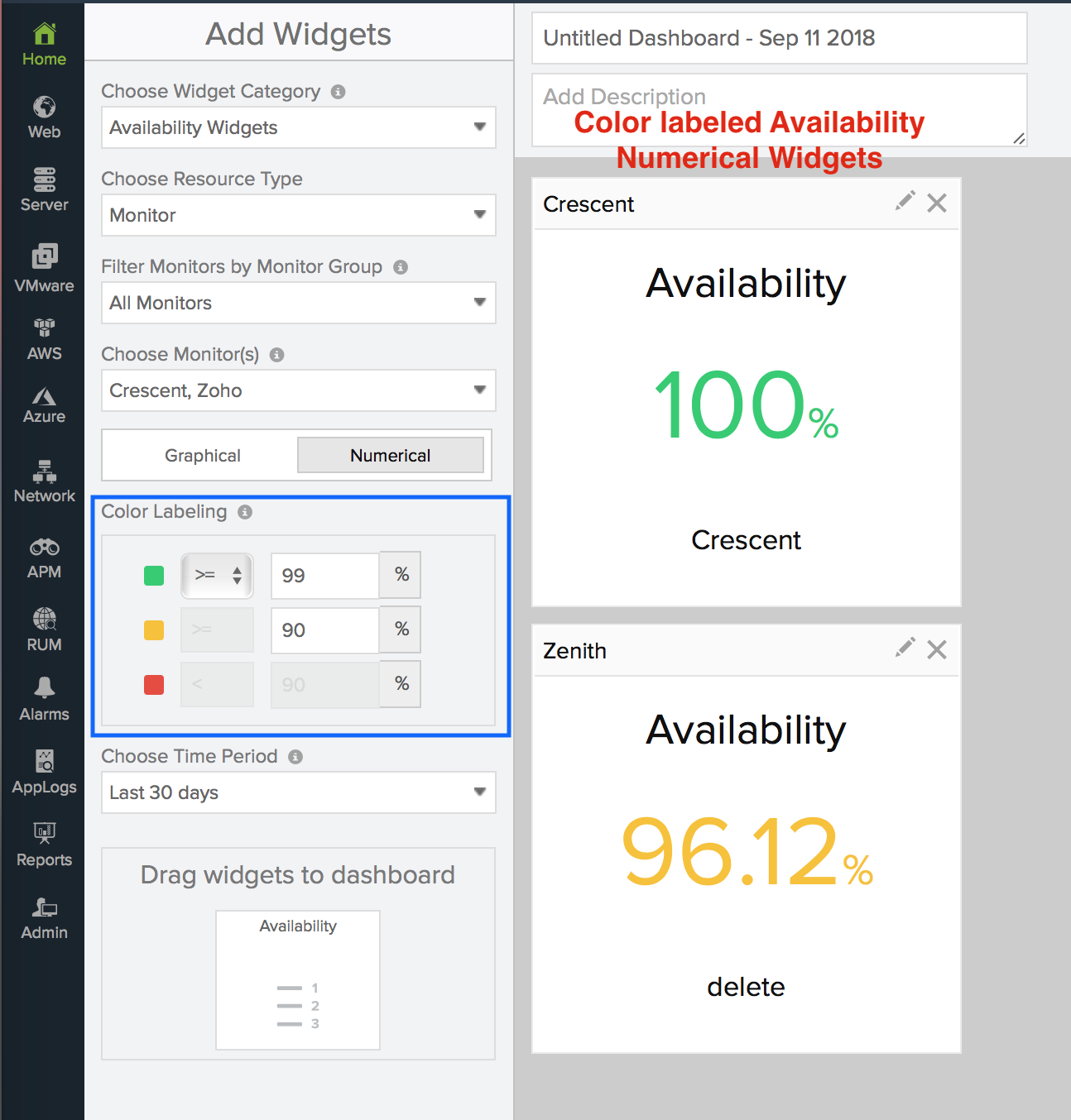 We're happy to announce that your feature request on color labeling is now live for the availability and performance numerical widgets. By setting up unique conditions and specifying custom metric values, you can render the widget data in green, orange, or red. Once the actual data breaches any of the defined conditions, the corresponding color gets applied to the value in the widget. You can learn more about this enhancement and new widgets by following our community post on Custom Dashboard.