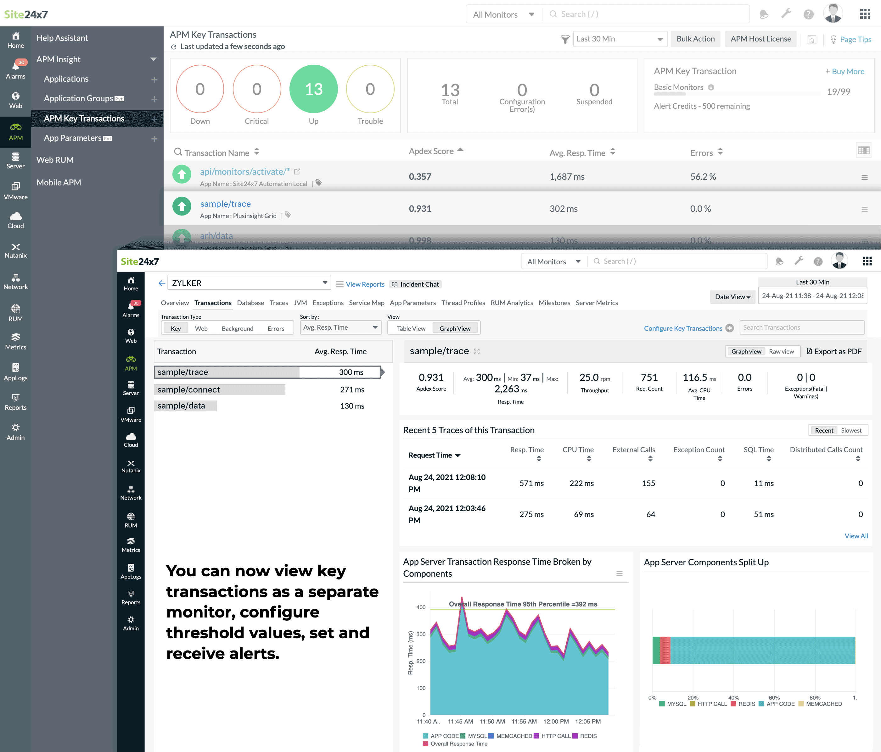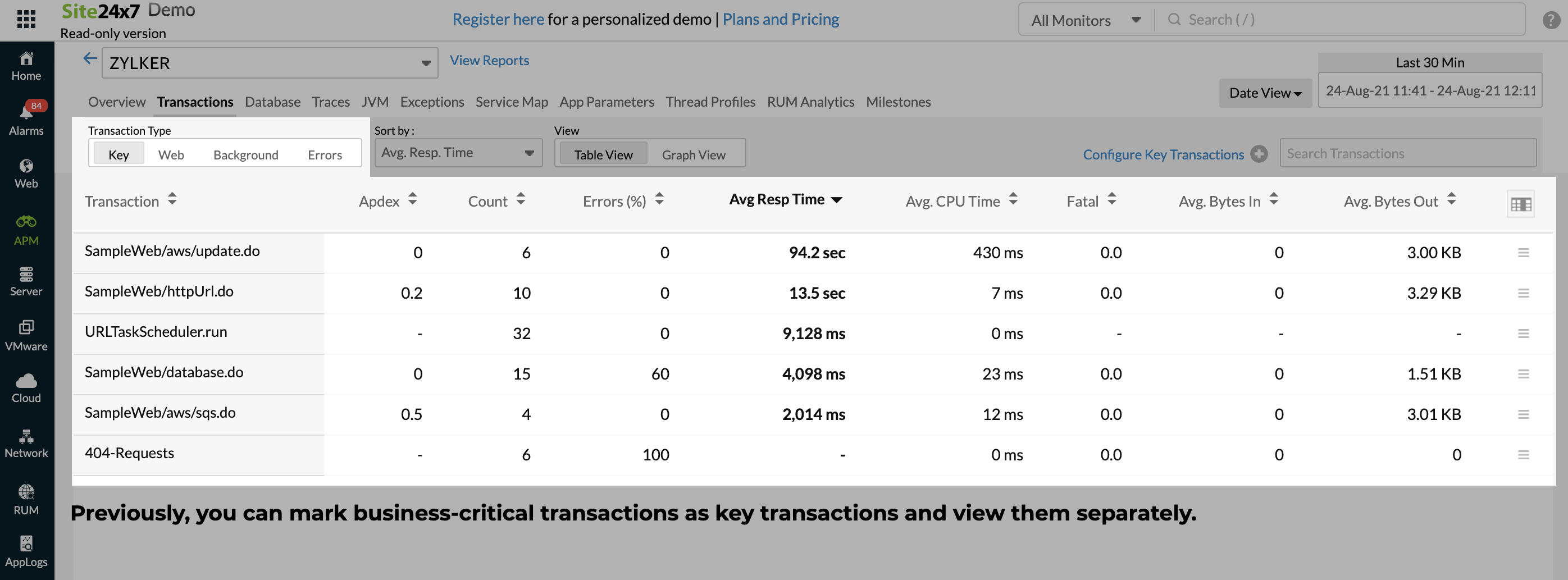 We are happy to announce that you can now set and receive alerts for key transactions configured for your applications in Site24x7 APM Insight.