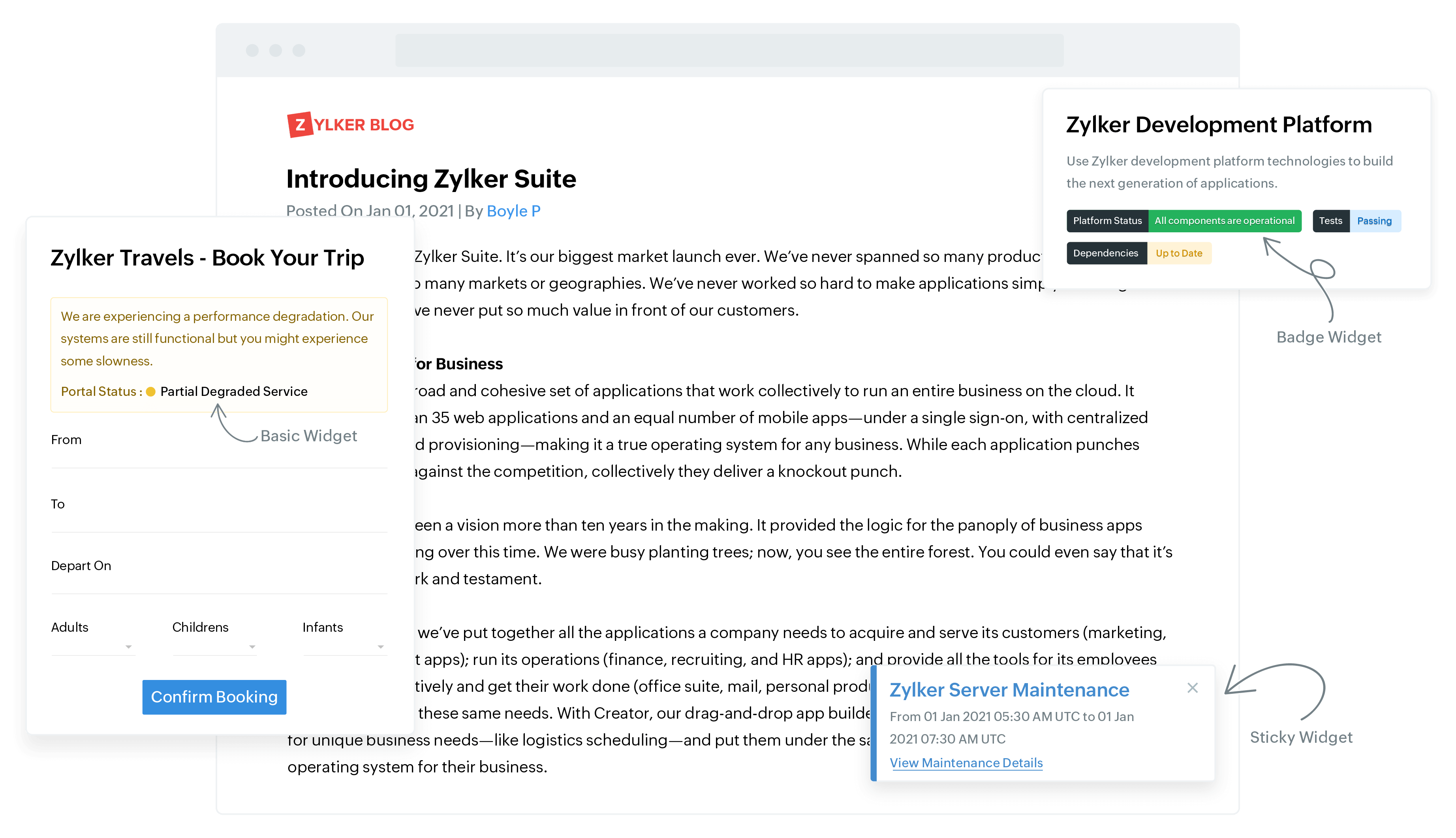 Users often have to access the status pages maintained by service or product owners to know if all services are available and to get information on active incidents and upcoming maintenance. To simplify access to this information, we're introducing status widgets. These are graphical widgets pinned on your website to display status updates, in three different styles.