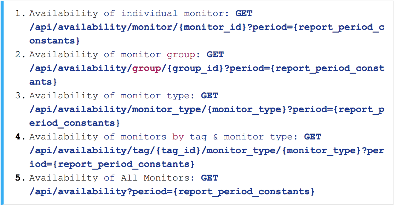 - You can use the Availability Summary APIs for your detailed availability and outage reporting when API overhead is not to be considered. However, the basic availability APIs are best suited for your daily reporting needs like quickly fetching the monitor group average values.