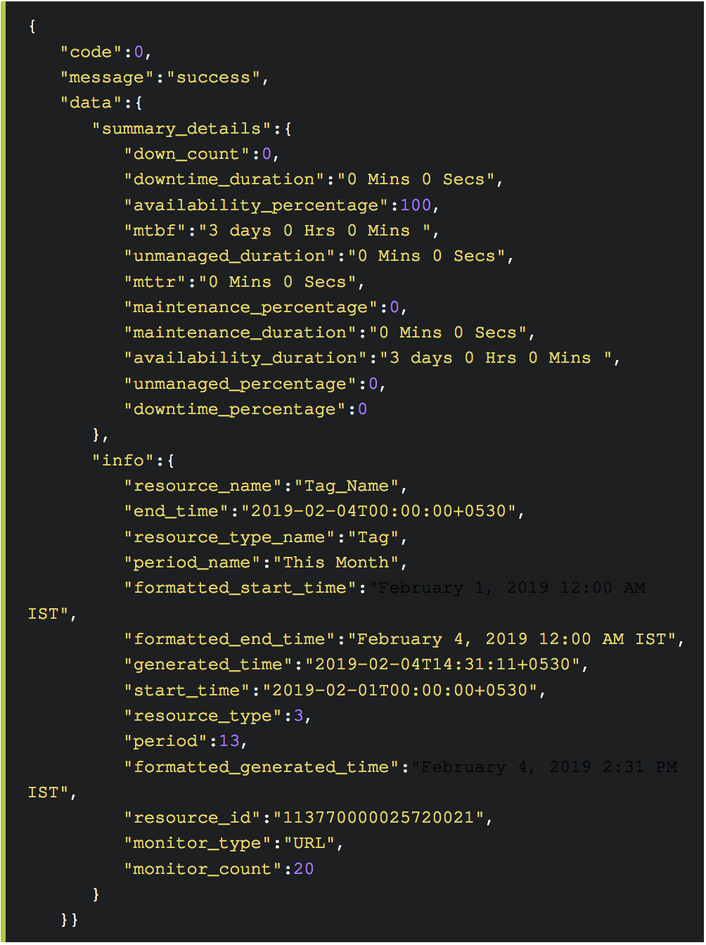 In comparison to our existing Availability Summary Report APIs, the lightweight basic availability APIs are tuned for a leaner reporting experience. By using archived data for availability calculations and introducing a lighter API response payload, data fetching will be much simpler and faster. The lightweight Availability API response consists of critical parameters listed under JSON objects summary_details and info.