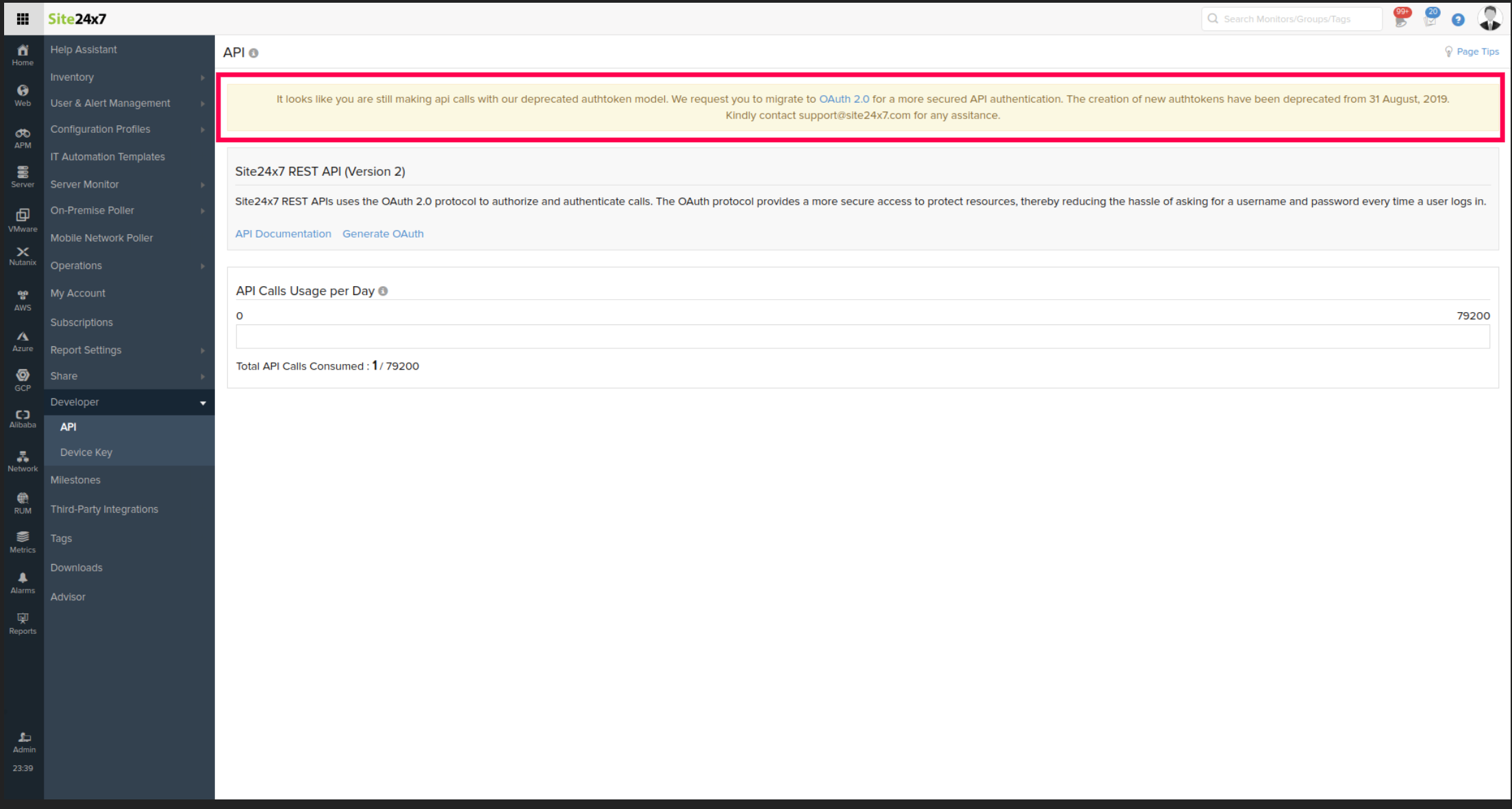 Site24x7 offers a comprehensive set of documented REST APIs for your monitoring and reporting needs. To provide a more secured access to your resources, we are migrating to OAuth 2.0 protocol from authtokens for authorizing the APIs.