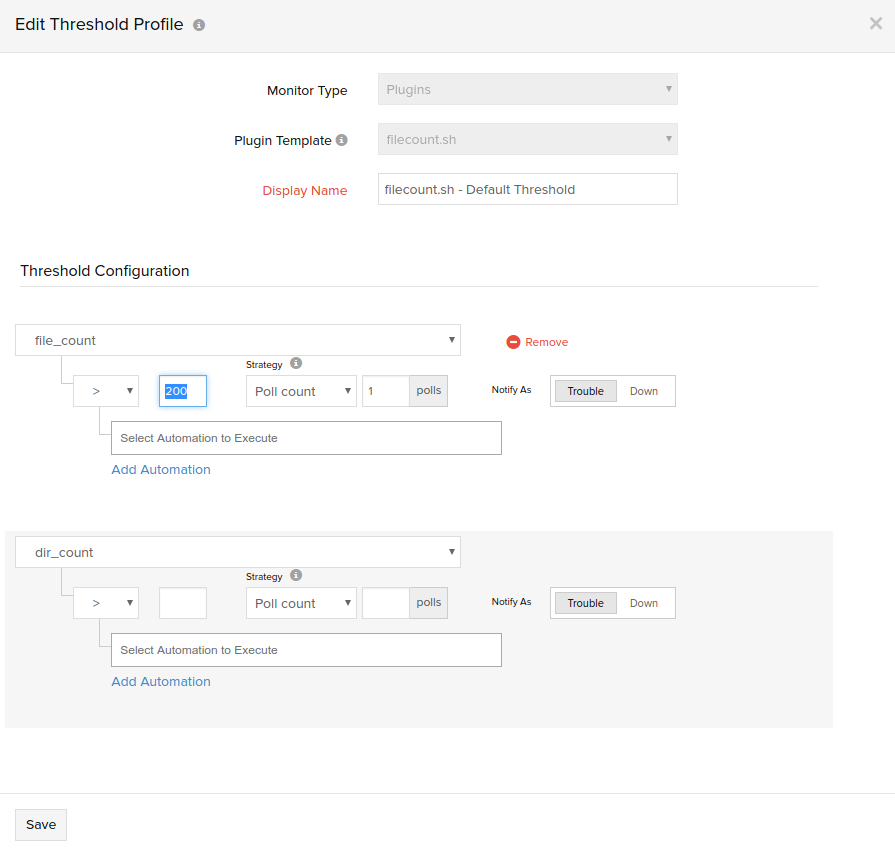You can also configure alerts for the file count metric. To do that, hover on the hamburger icon beside the display name at the top of the page, click Edit. In the Edit Plugin Monitor page, click on the pencil icon beside Threshold and Availability. In the Edit Threshold page, configure thresholds for the file count metric and save your changes.
