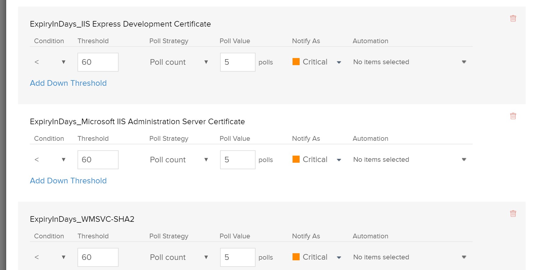 Attaching a simple Custom Plugin that I wrote that will get the expiry days in the server in C#.  This would help in monitoring the certificates in the server. You can configure the threshold such that the expirydays is less than your threshold value. I set mine as 60 days.