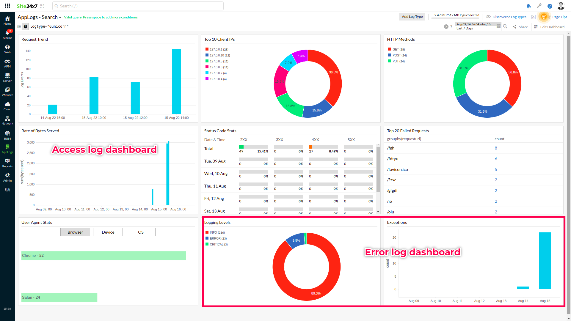 Consider the scenario where you wish to create a log type for the Gunicorn (Python web server) access and error logs. With the ease of multiple log pattern supports, you can create separate log patterns for access and error logs under a single log type.