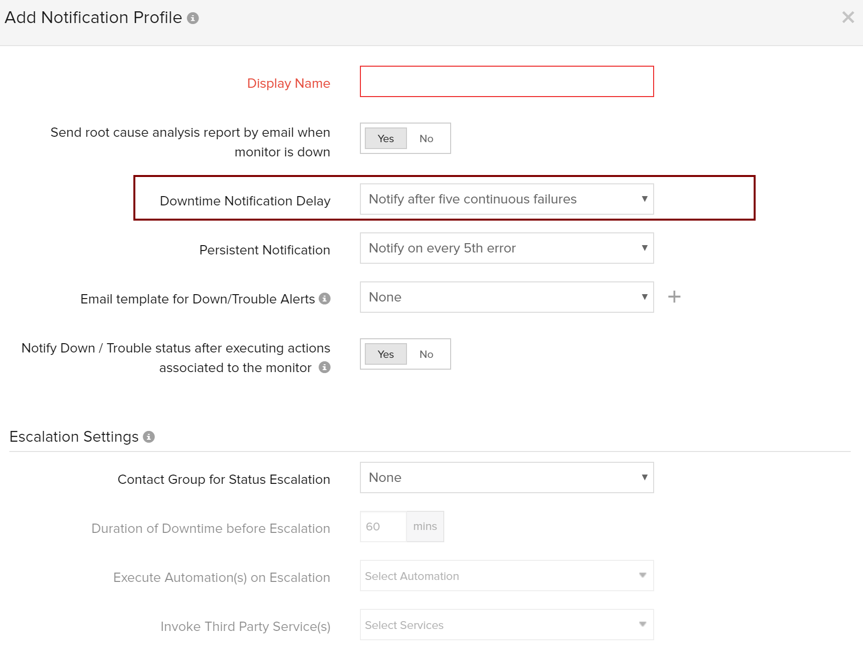 Admin -> Configuration Profiles -> Notification Profile is where you will find it. Once this is set for the monitor you will receive a notification only after the configured delay.