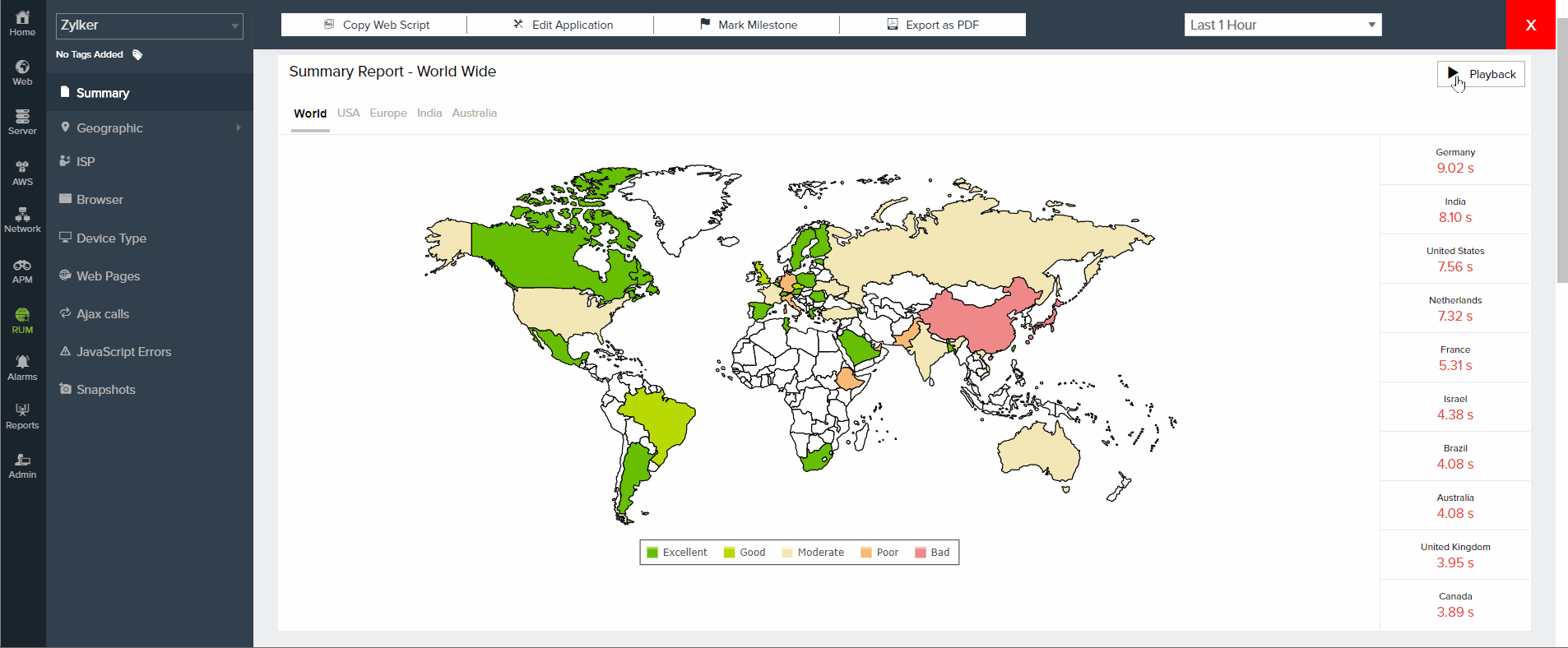For instance, if you were to play back your application performance for the last seven days, you could view the variations in your application response time across various countries for each day. You can also assess performance data anywhere from the last hour to the last 30 days with fine details. These details enable you to visualize subtle performance changes across various locations and assist you in taking immediate actions.