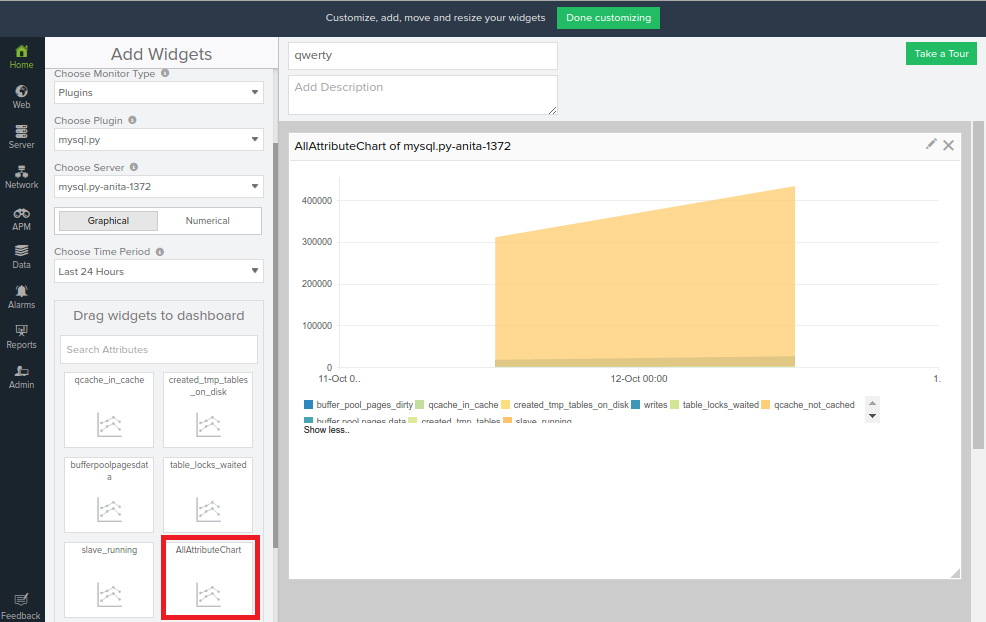 - Drag and drop AllAttributeChart into the dashboard. This will create a graph displaying all the metrics of your plugin as a single graph.