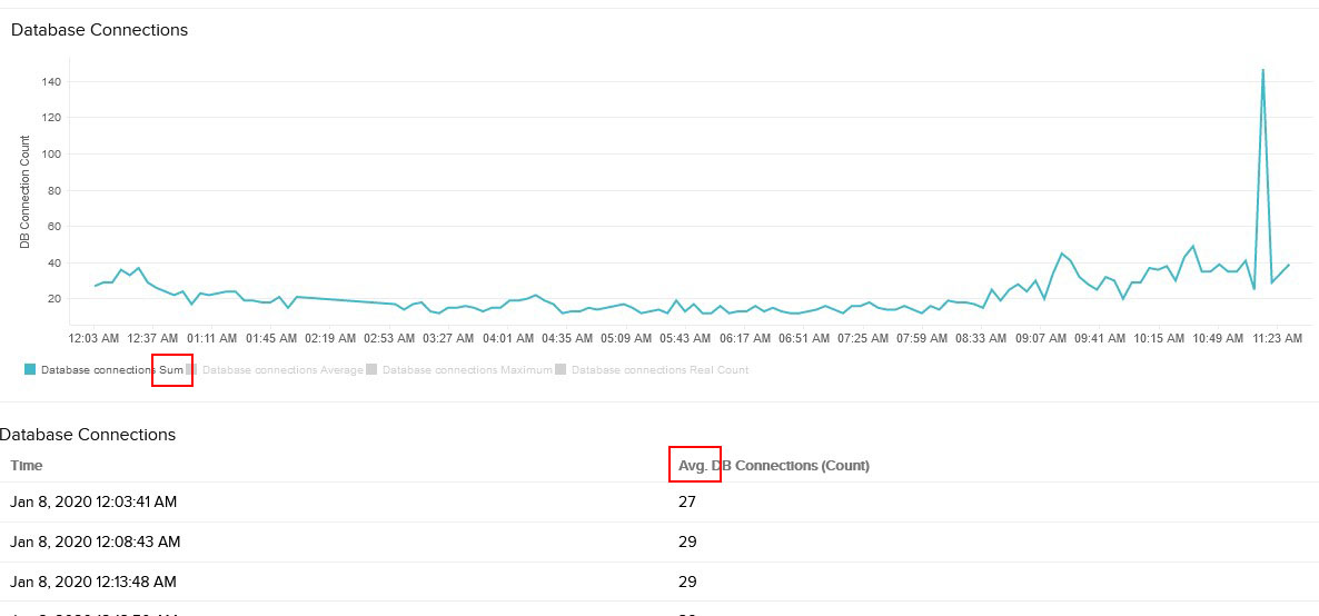 The other odd things is that the DB connections chart dataset labeled "Database connection Sum" actually matches with the raw datatable numbers with the column heading "Avg. DB Connections (count)." See attached image.