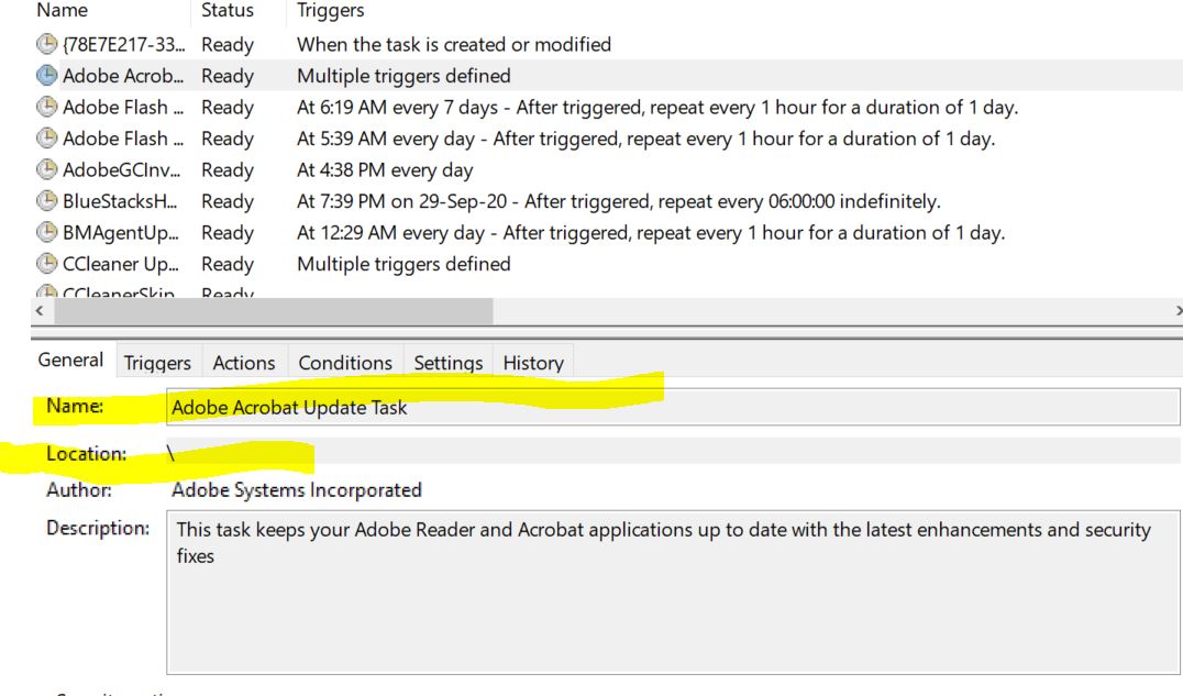 In screenshot task1, the name is 'Adobe Acrobat Update Task' and path is '\'. Provide the task name in the script as 'Adobe Acrobat Update Task'.