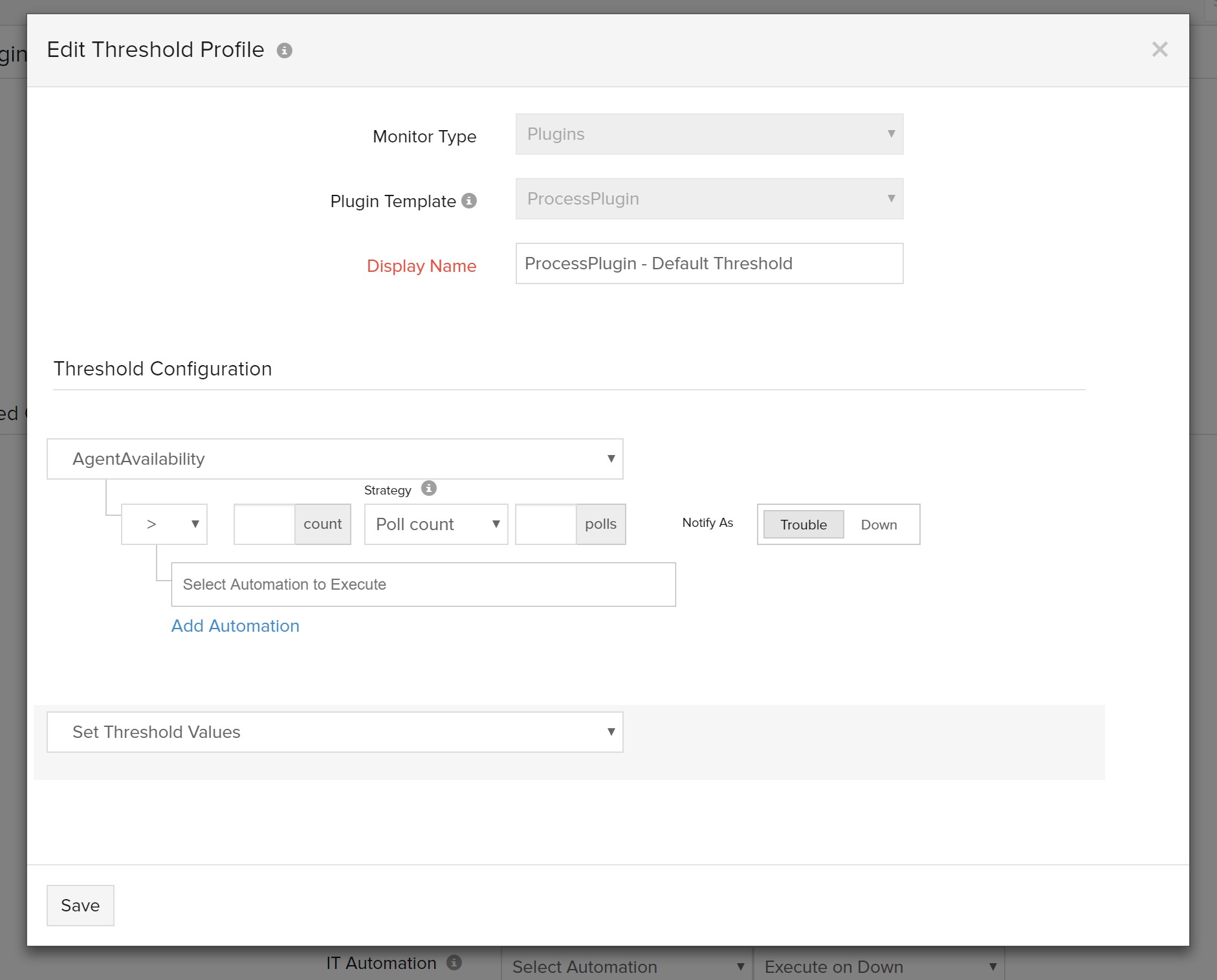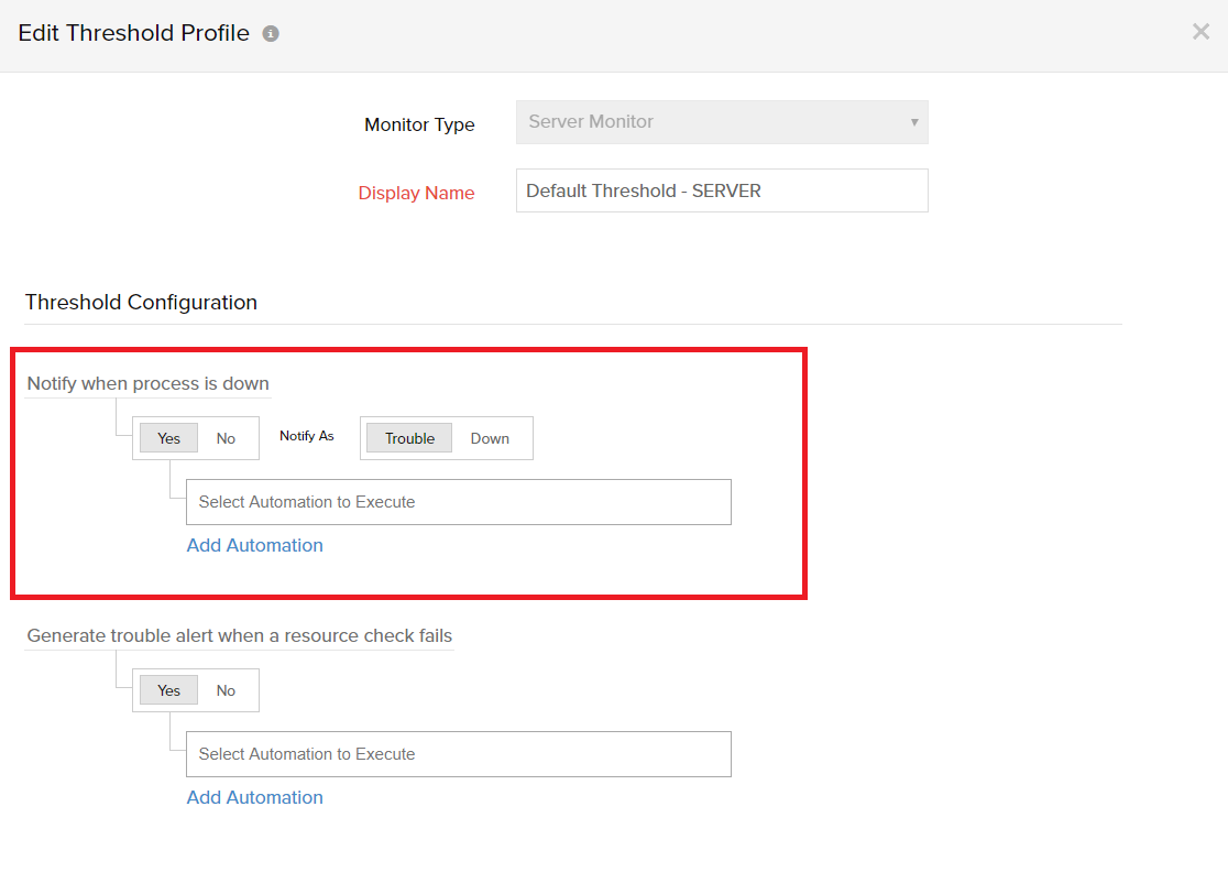 - Toggle to the option YES for the option Notify when process is down. You can also choose to be notified with a TROUBLE or DOWN alert.